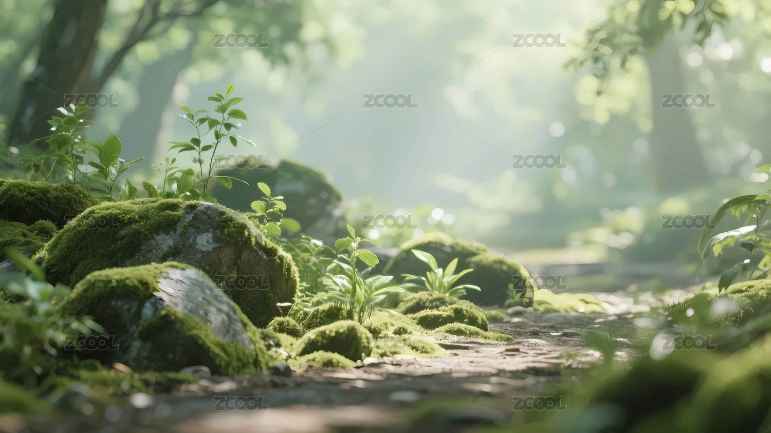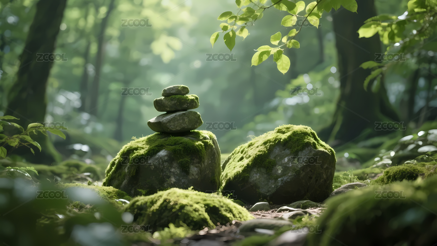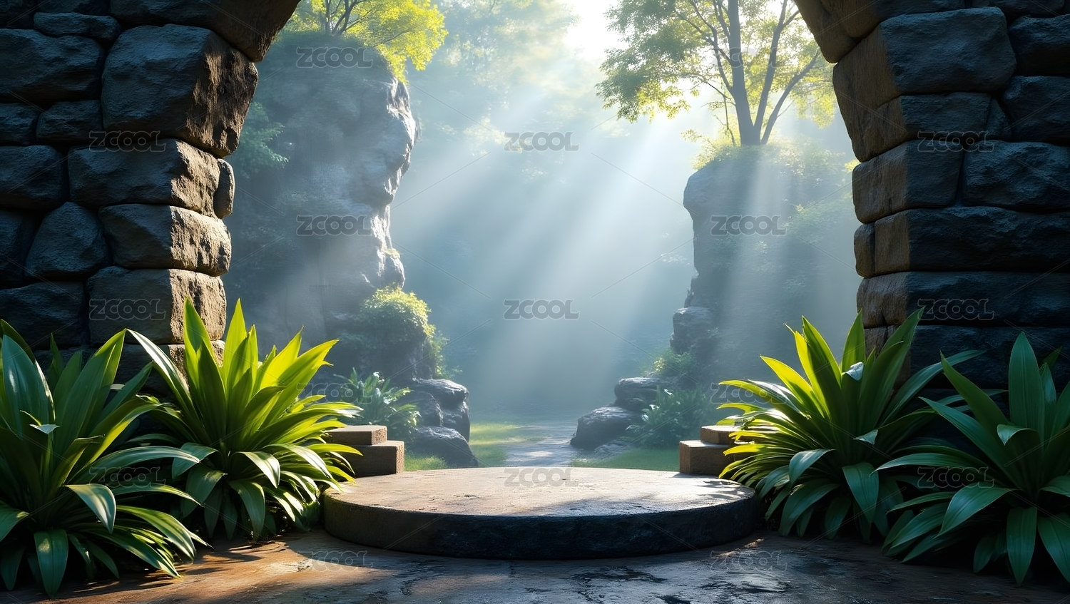 自然,绿色,神秘,喷泉,苔藓,森林,雾气,阳光,石制,古朴
