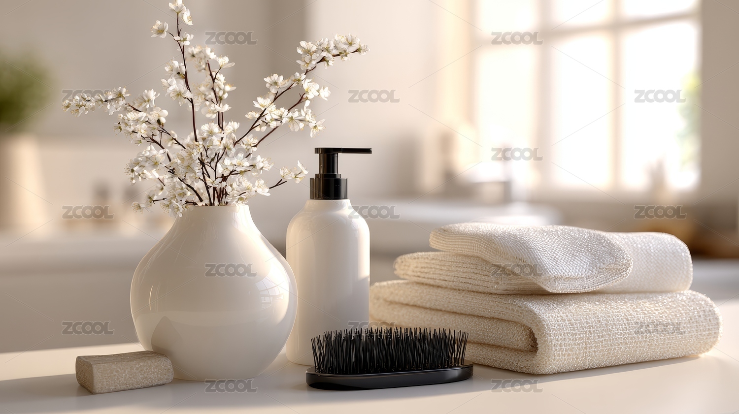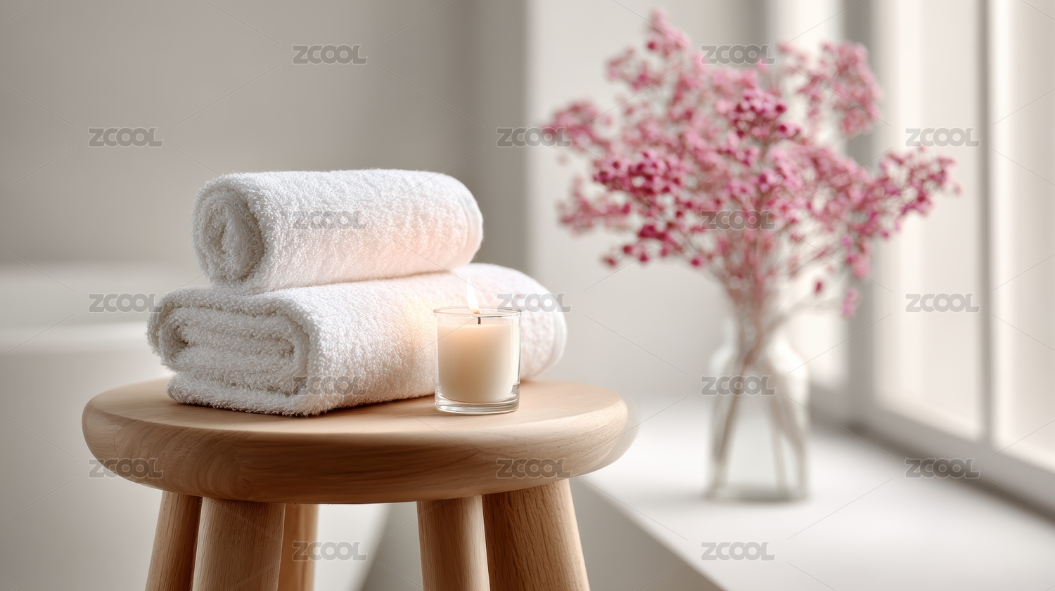 窗边堆叠毛巾上放香皂的温馨静物素材
