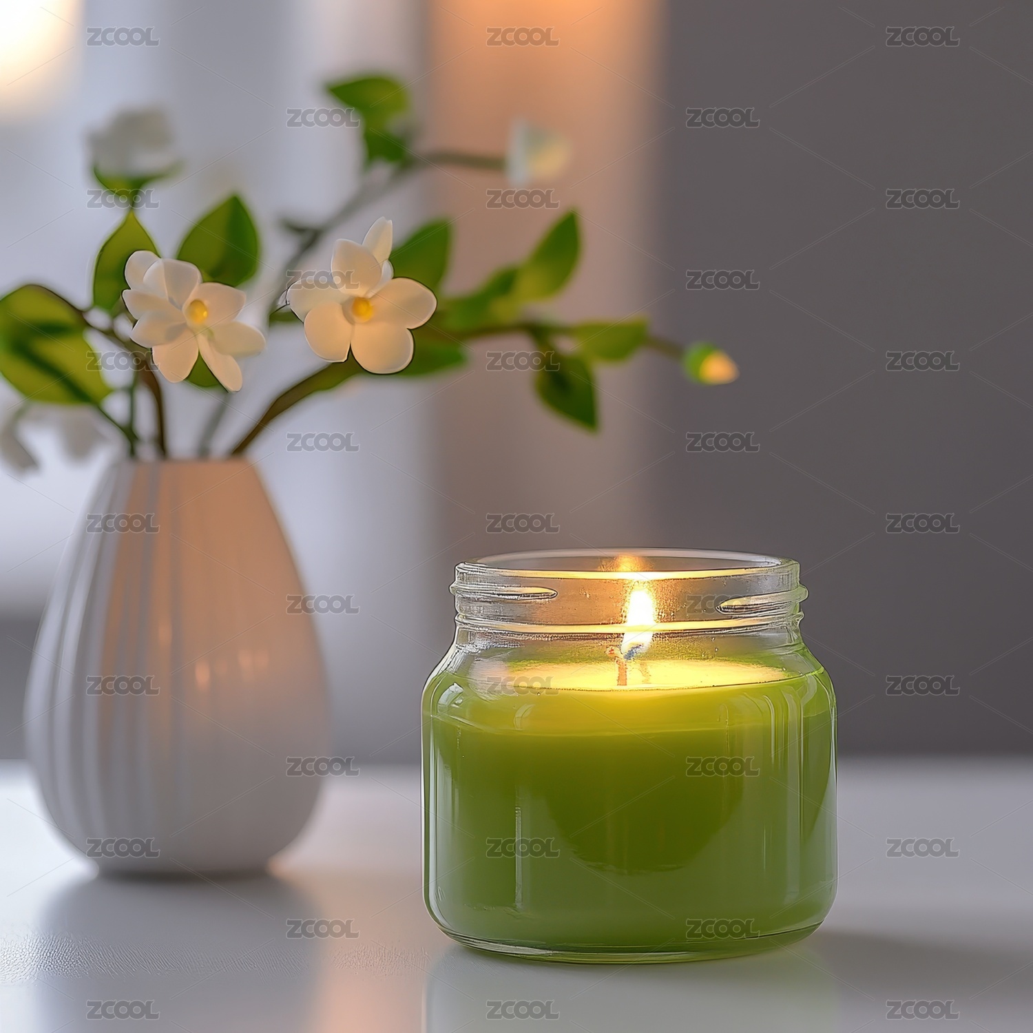 绿色,蜡烛,燃烧,火焰,静物,装饰,白花,花瓶,白色,花枝