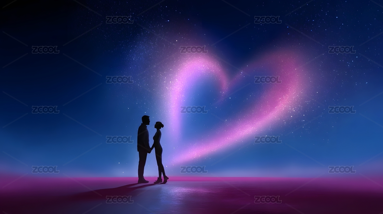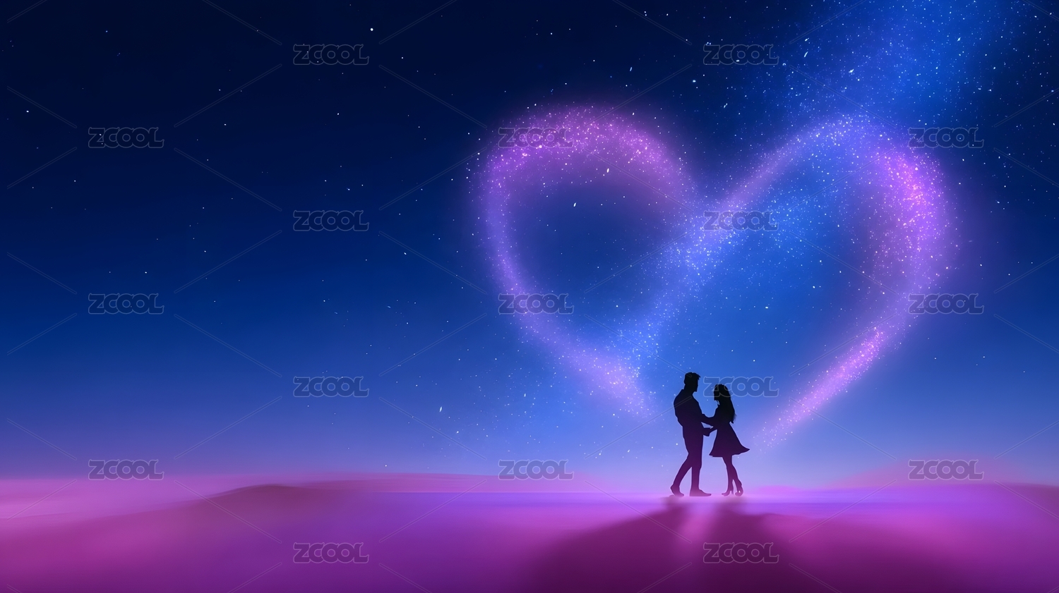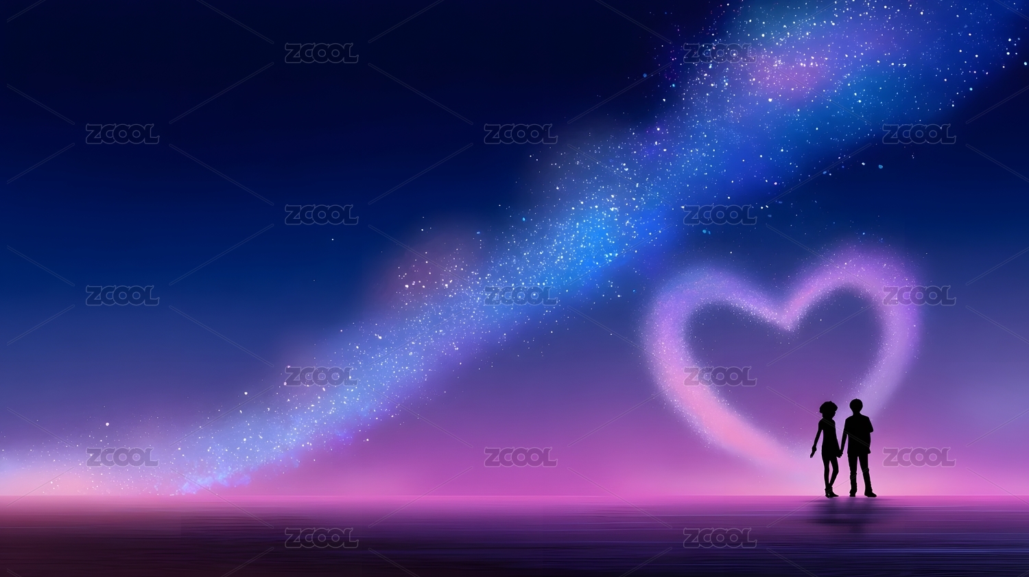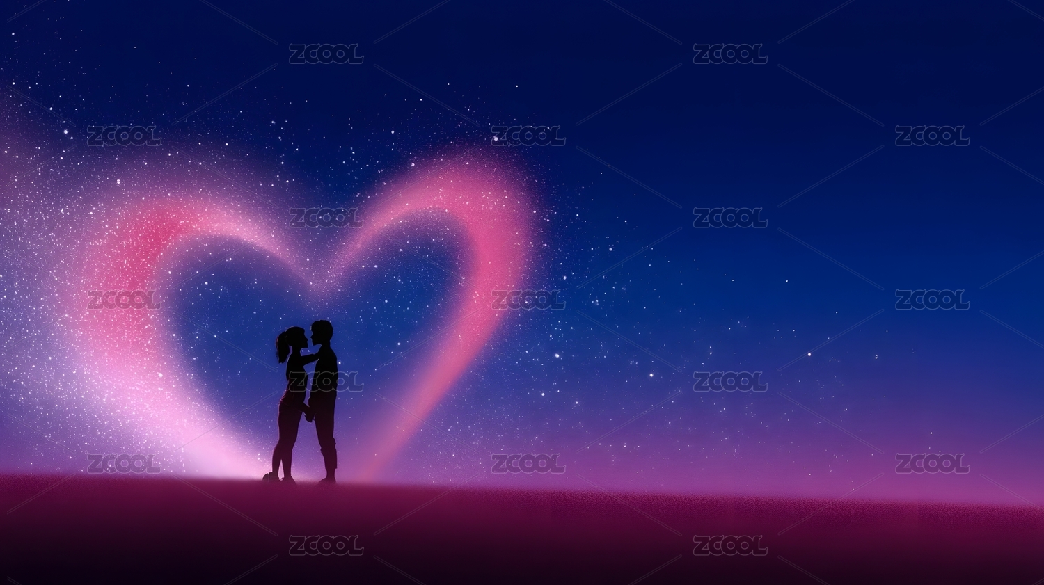 情人节,浪漫,爱心,星空,剪影,夜晚,粉色,紫色,蓝色,地平线