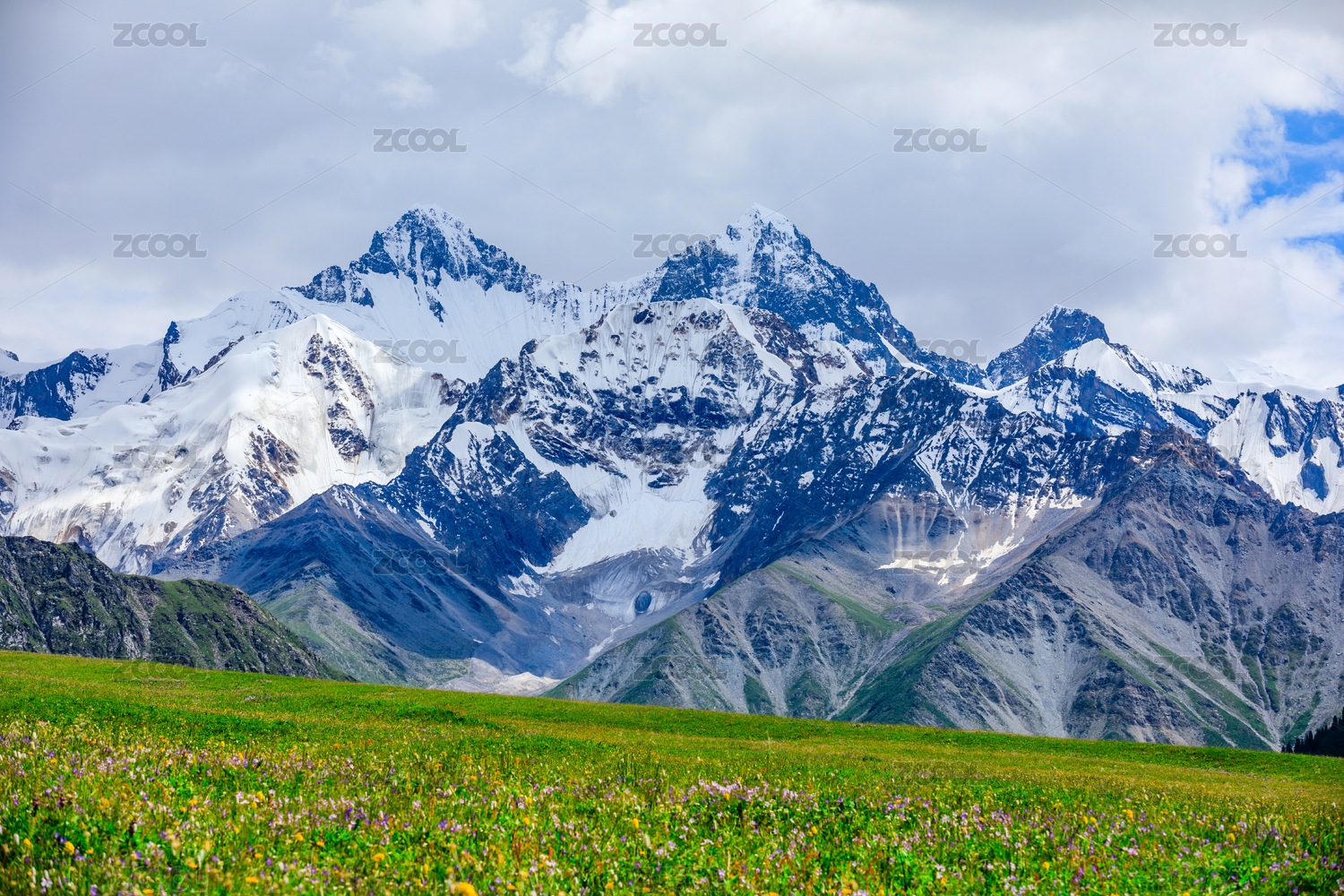 雪山,山脉,草地,云雾,自然风光,高山,山峰,绿色,天空,山峦