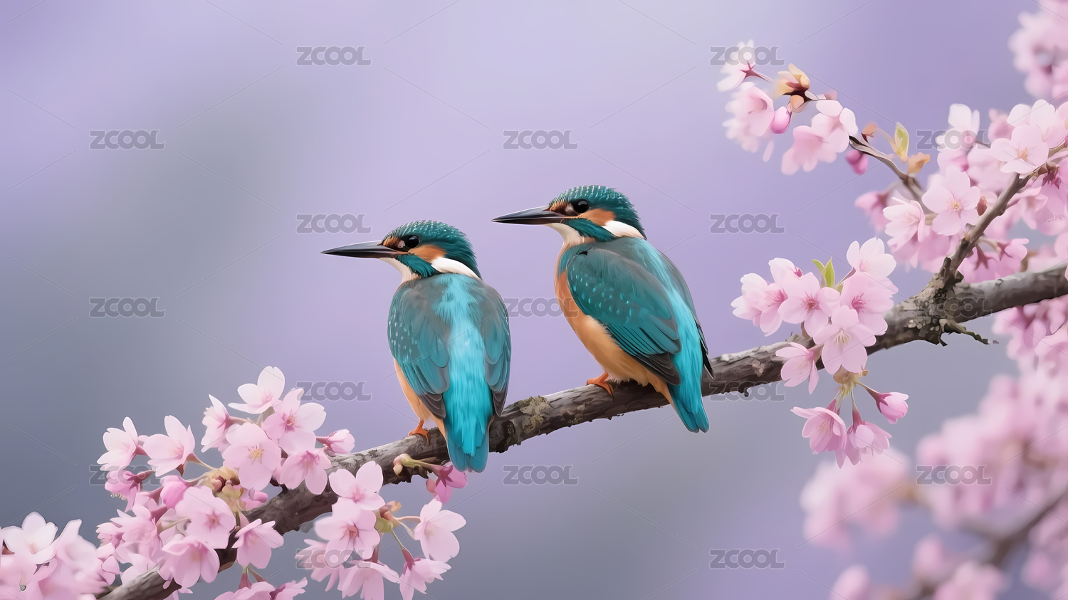 粉色花枝上两只小鸟甜蜜依偎
