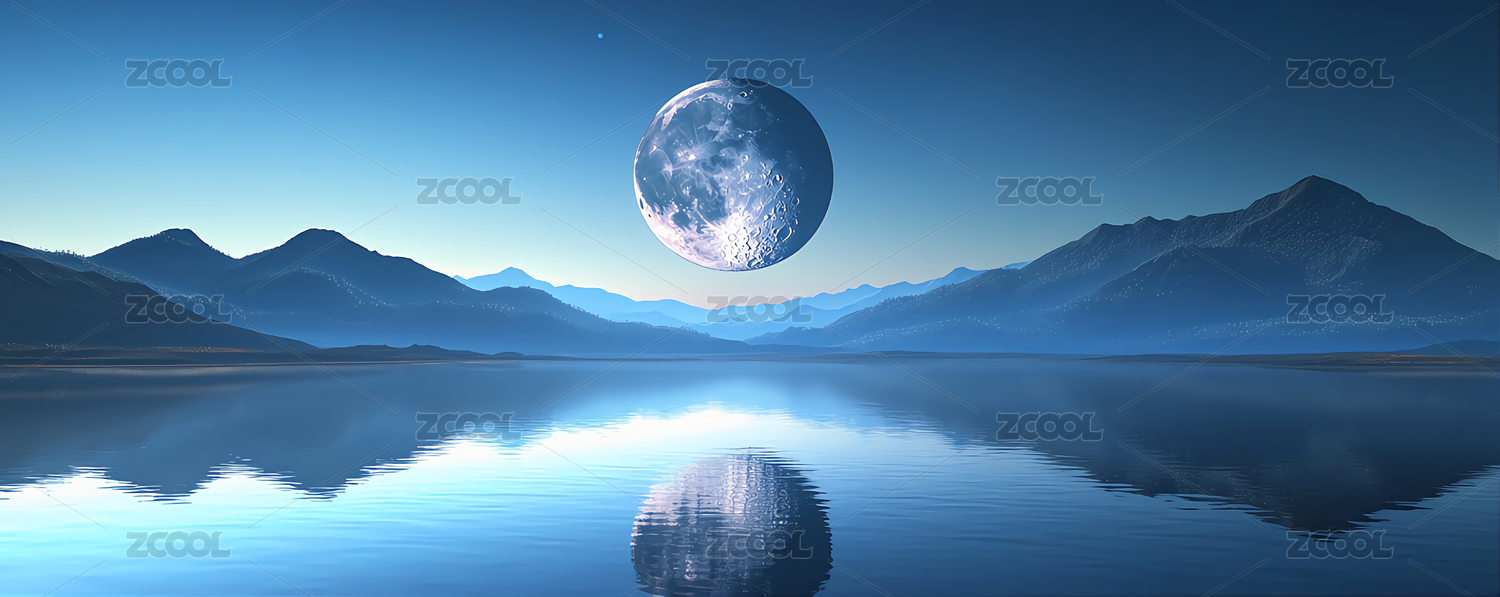 满月映照湖面群山环绕夜景