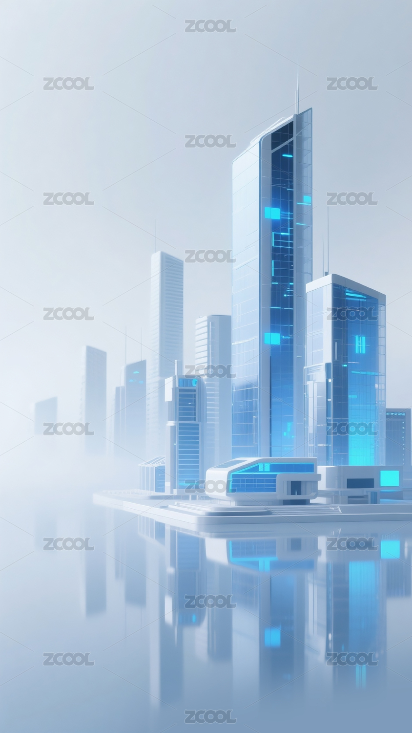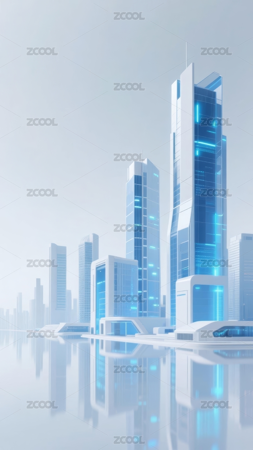 科技感的3D渲染风格蓝白色调的未来建筑