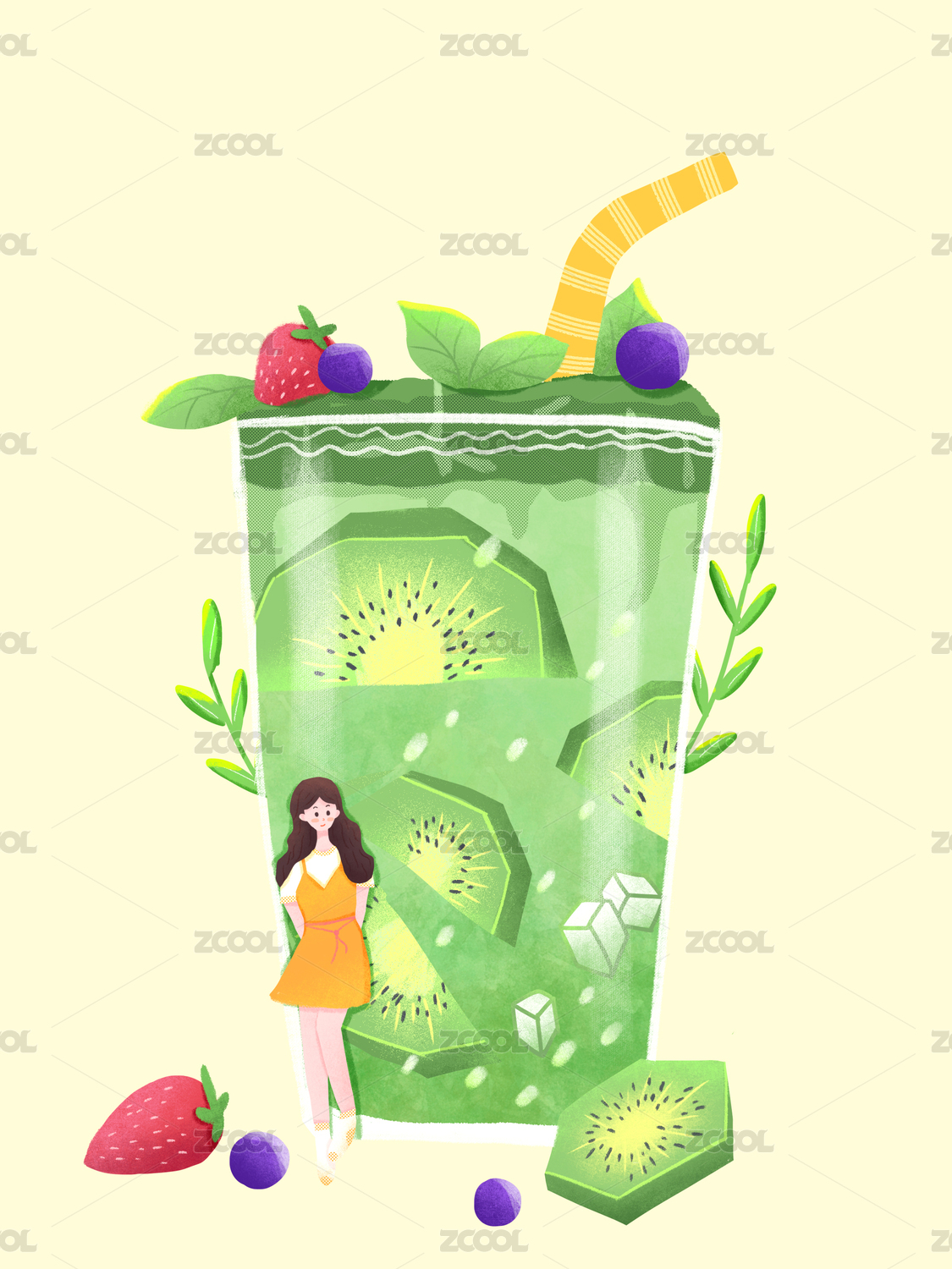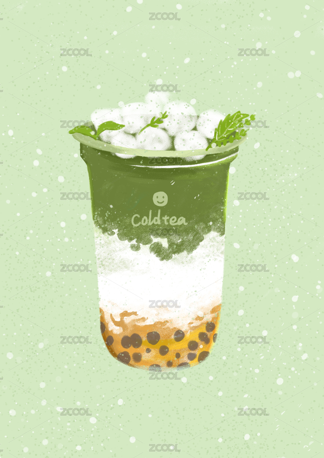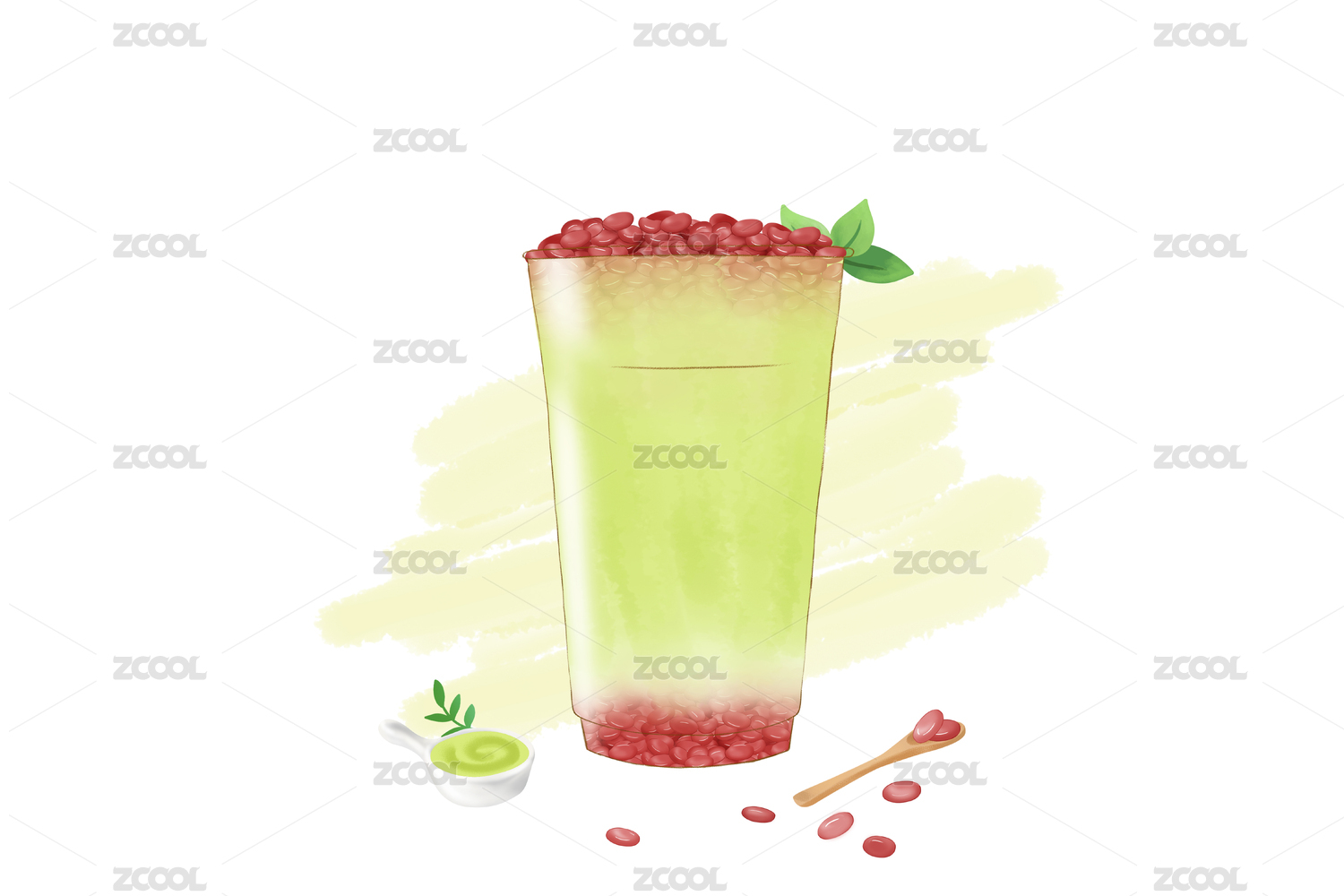 插画,夏日,冰饮,饮品,玻璃杯,奶盖,小女孩,抹茶,红豆,可爱风格