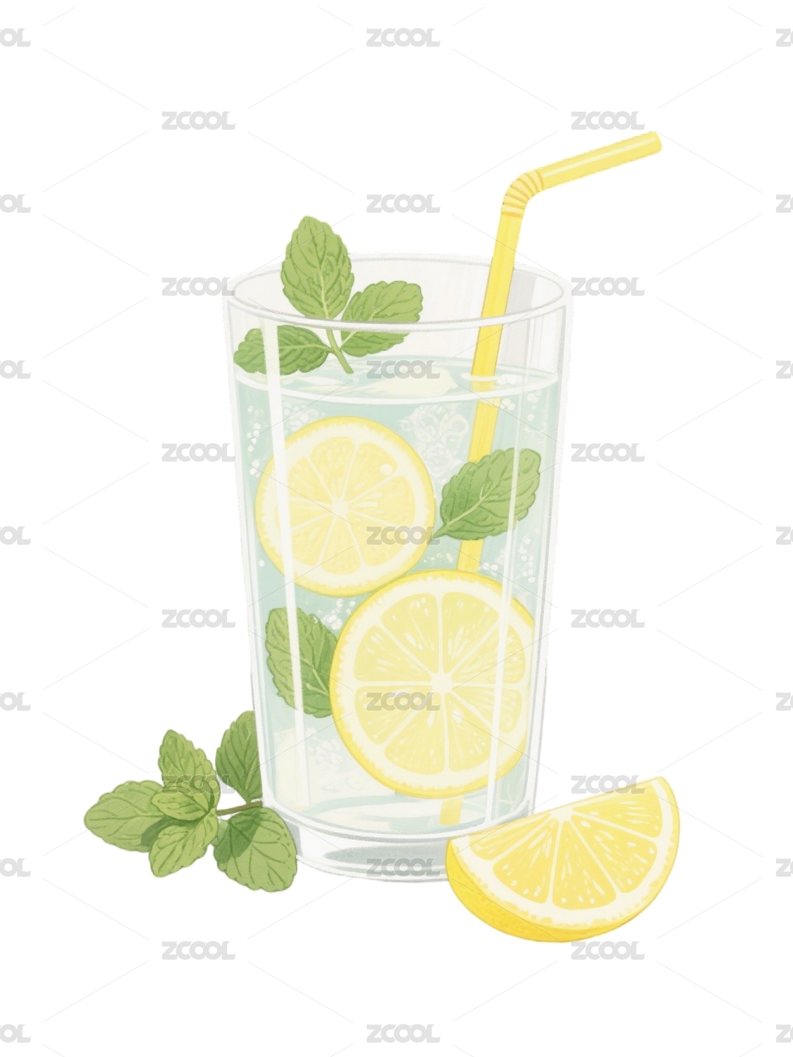 黄色柠檬饮品配薄荷插画