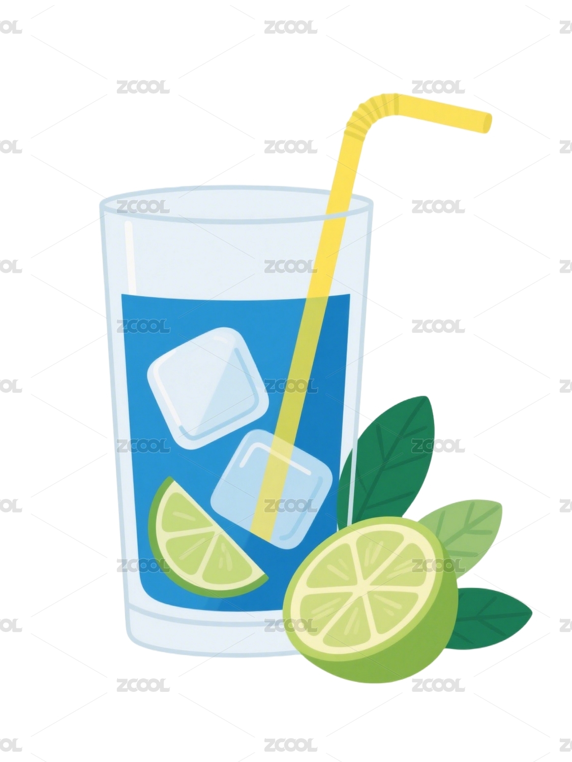 蓝色冰饮配黄吸管青柠插画
