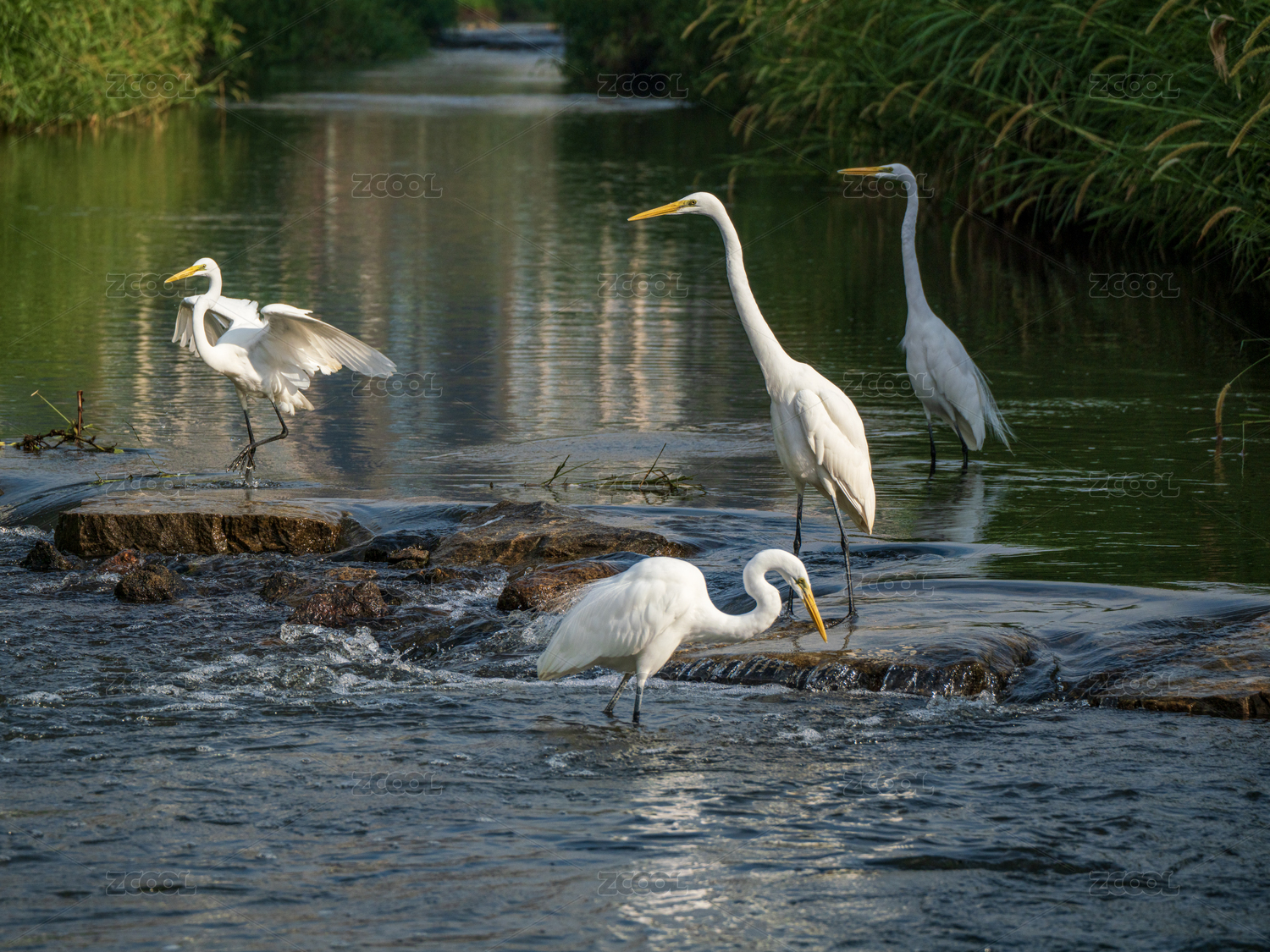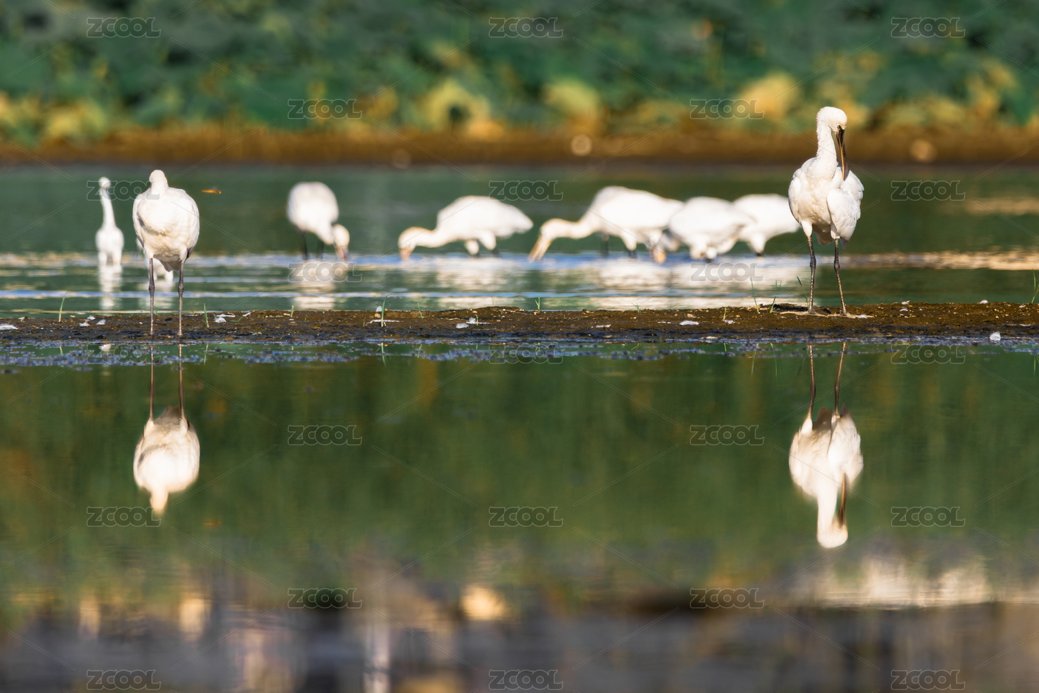 在沼泽地滩涂苇塘等处涉水觅食的白琵鹭鸟