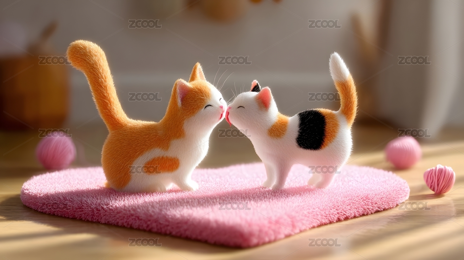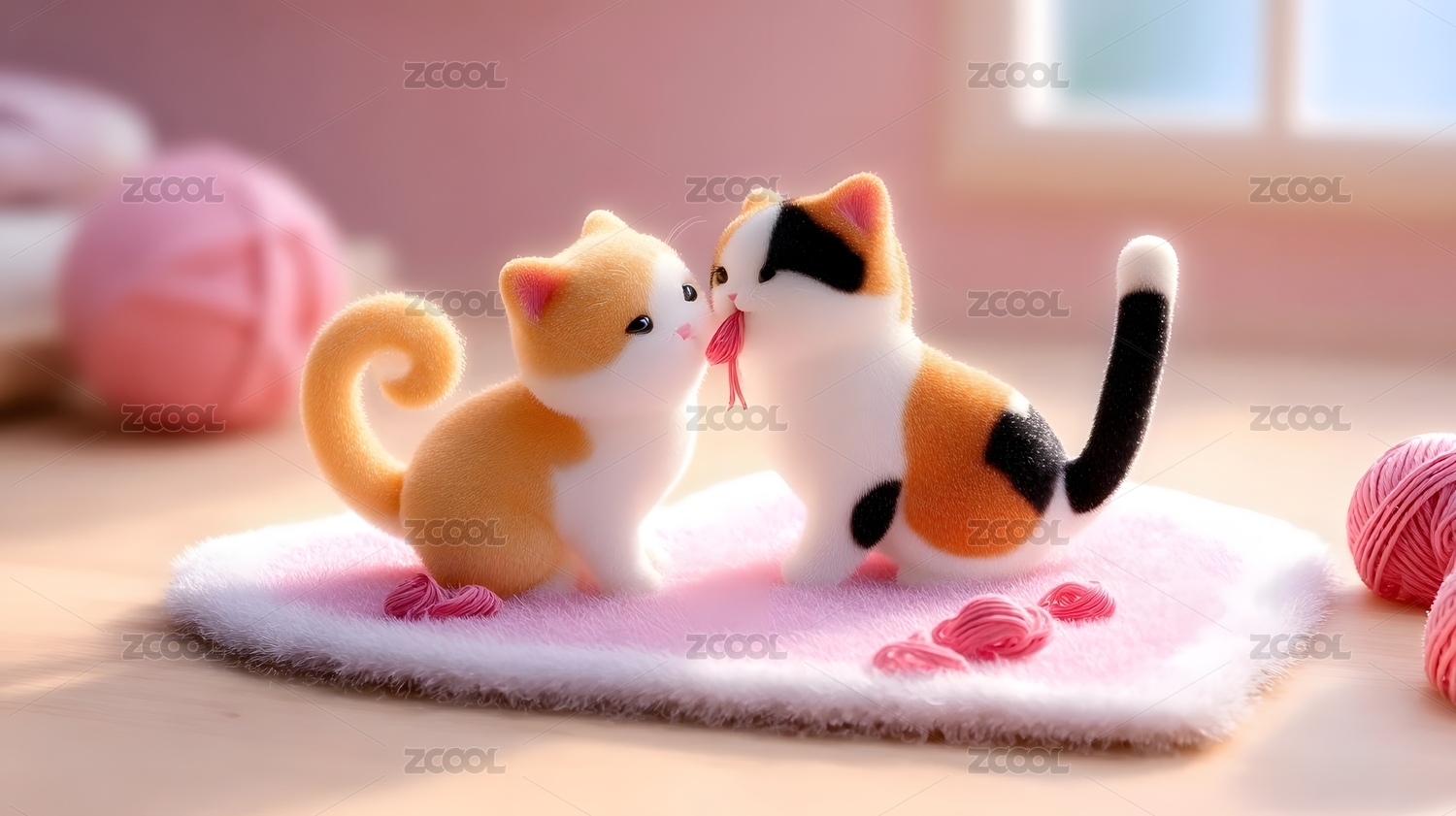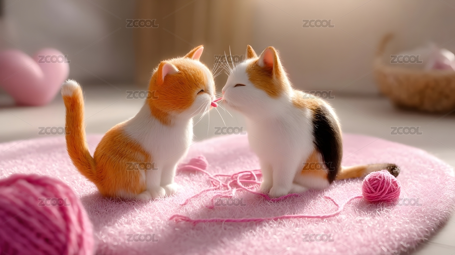 情人节,小猫,毛线,粉色,地毯,玩耍,互动,室内,可爱,毛绒