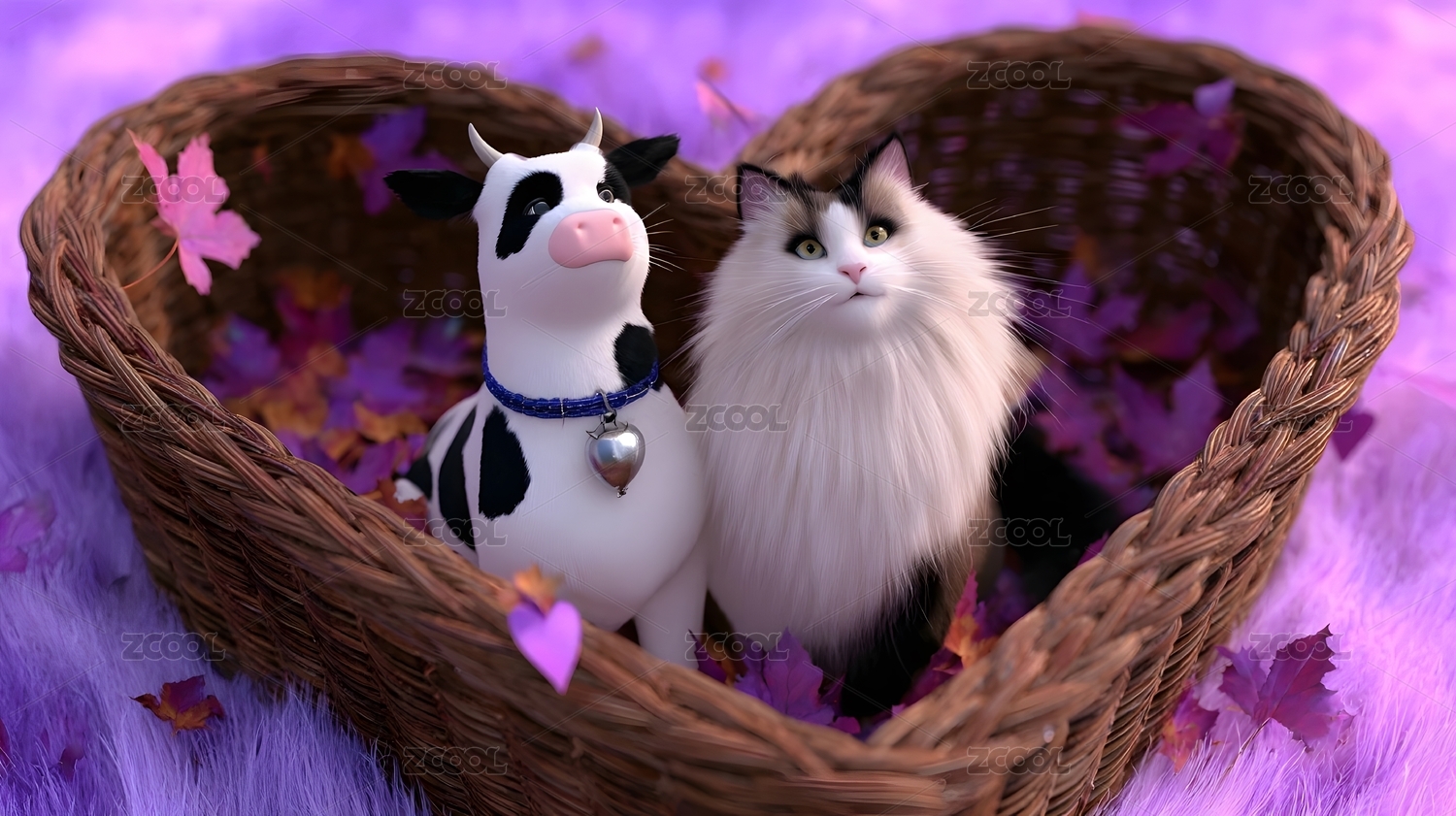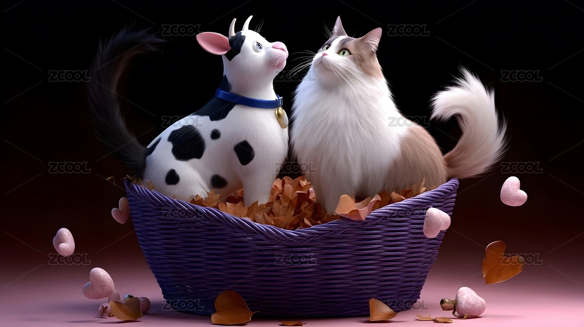 爱心篮中的牛和猫