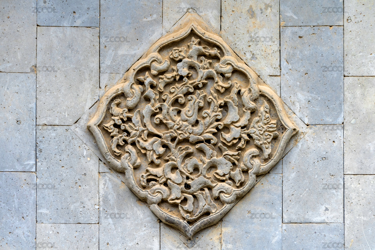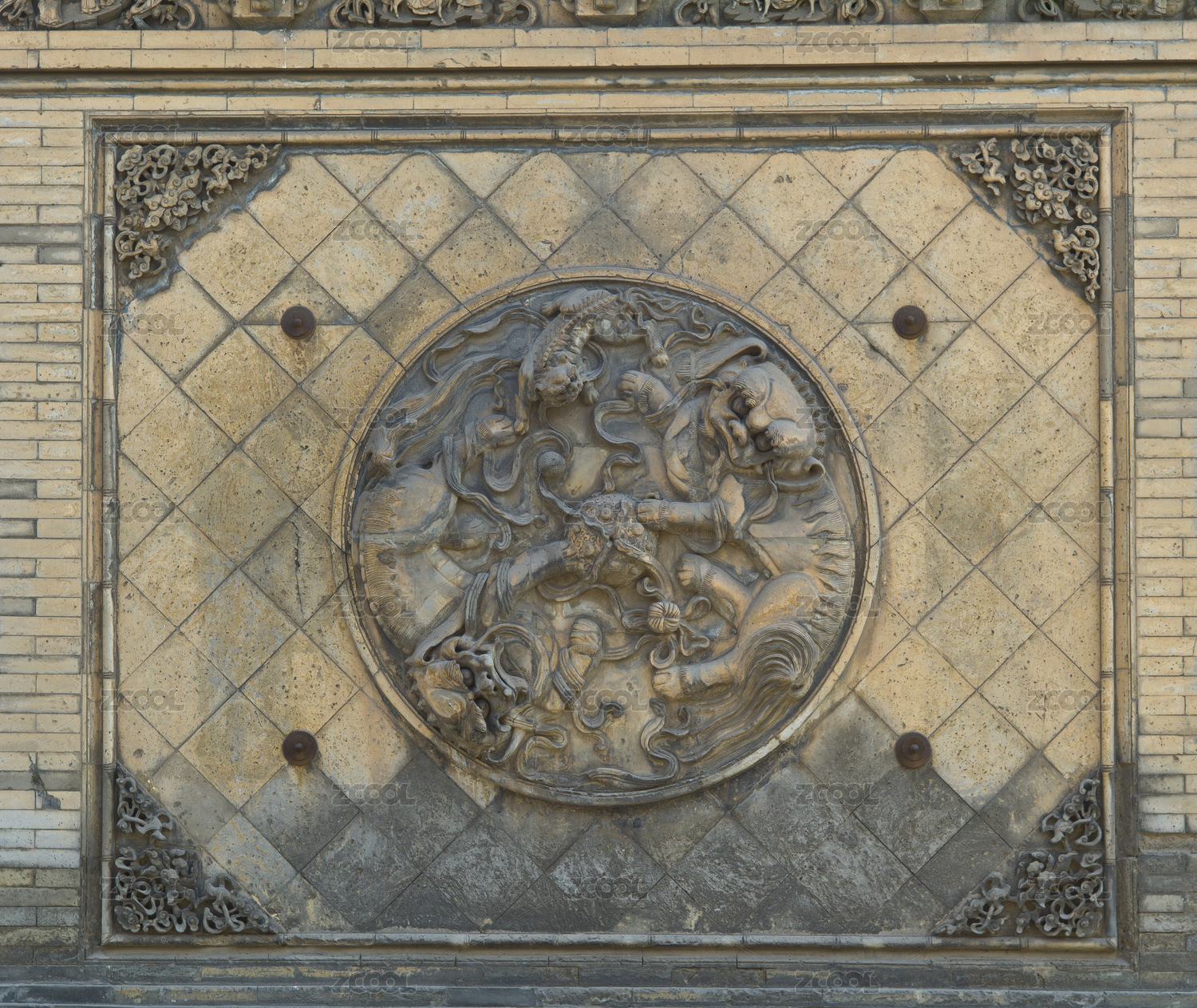 中国山东省济南市趵突泉公园内的灰砖砖雕影壁墙