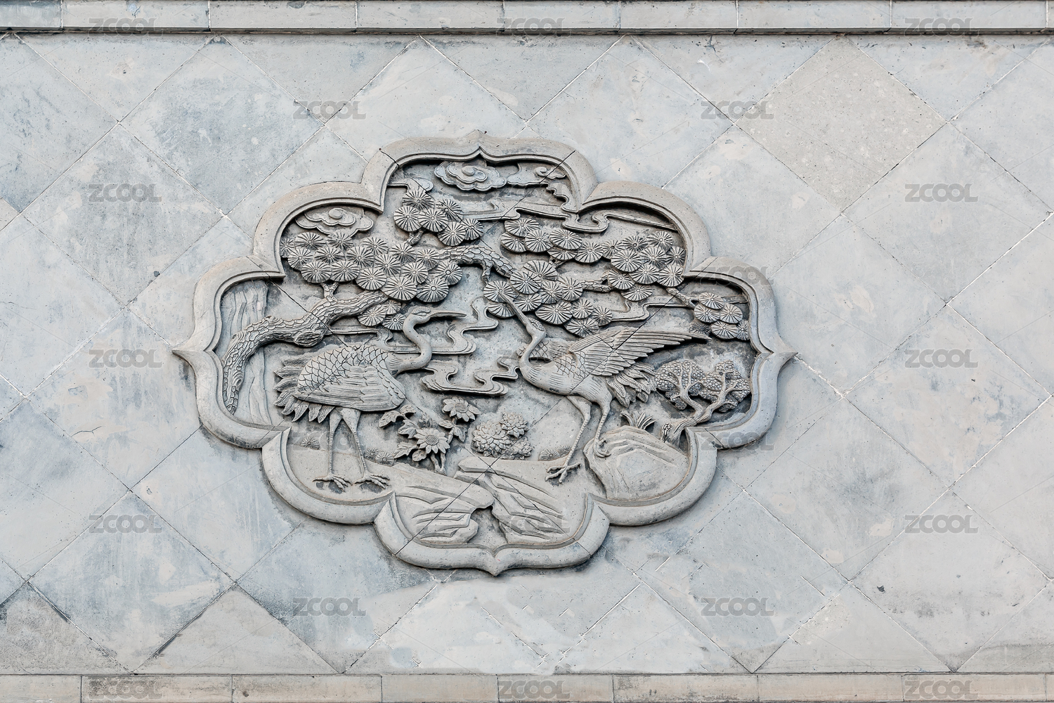 颐和园中式传统影壁的芙蓉花植物纹样砖雕特写