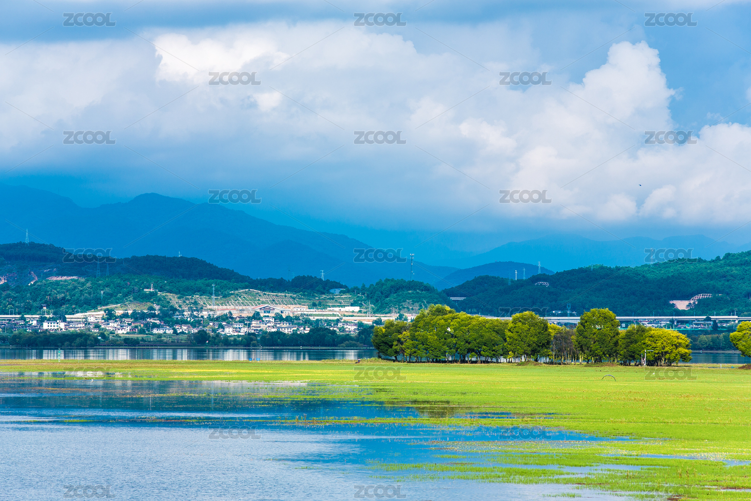 中国云南省丽江市,拉市海湖泊前的空旷草坪