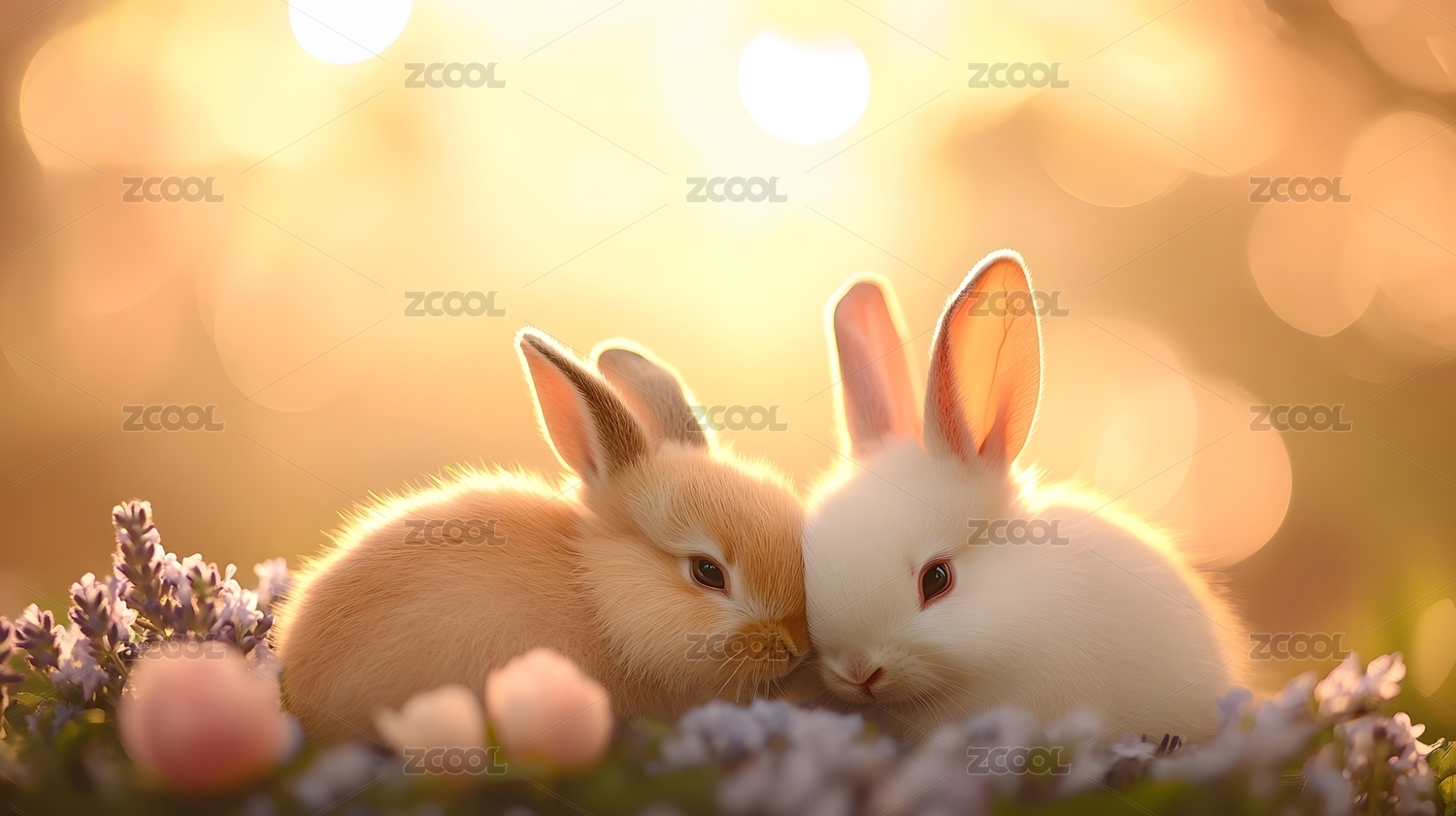 两只小兔在花丛中依偎