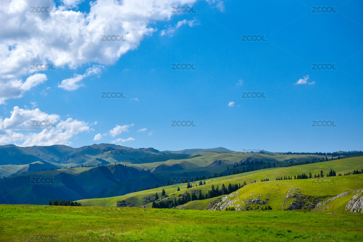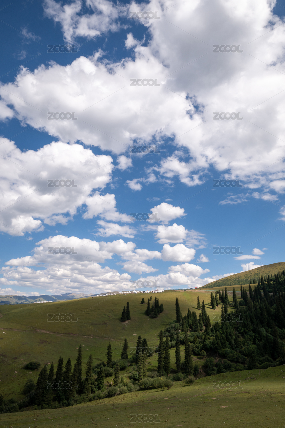 蓝天白云下的中国新疆伊犁天然牧场自然风光