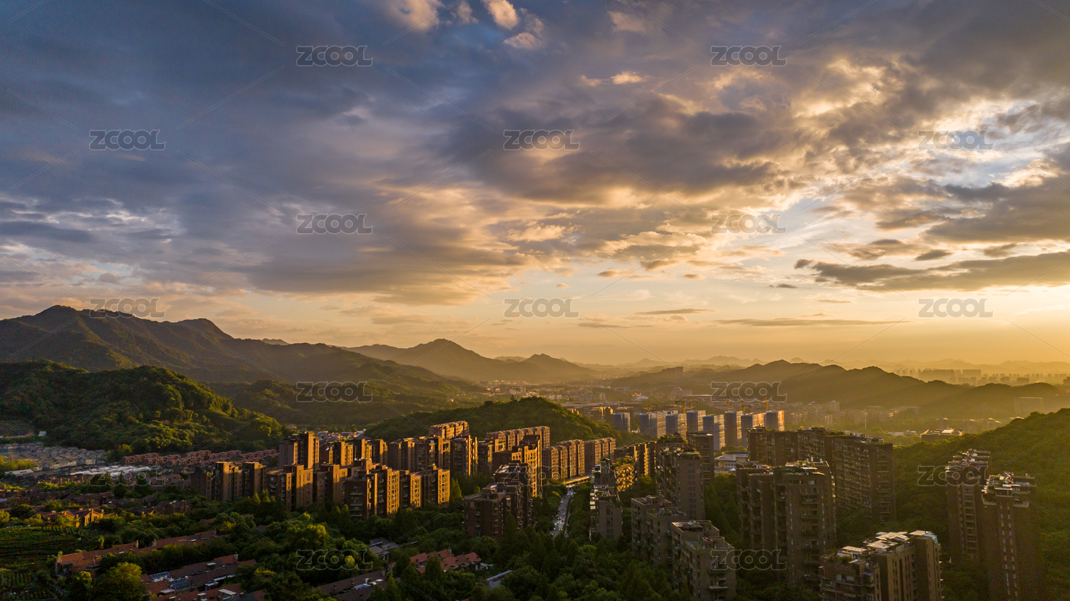 航拍多云天空下的山和建筑