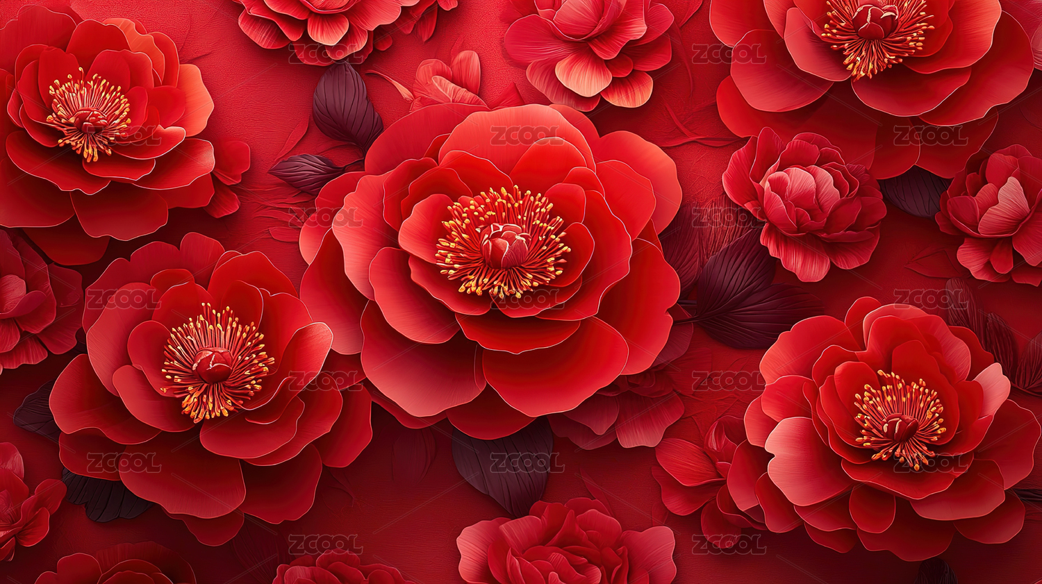 红色牡丹花与金色叶子背景
