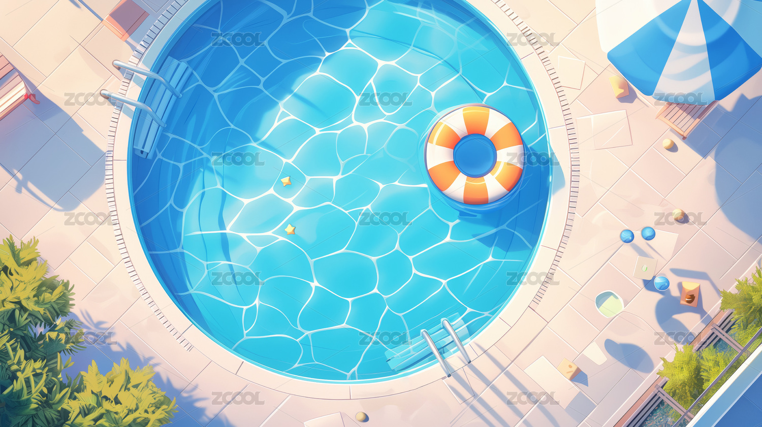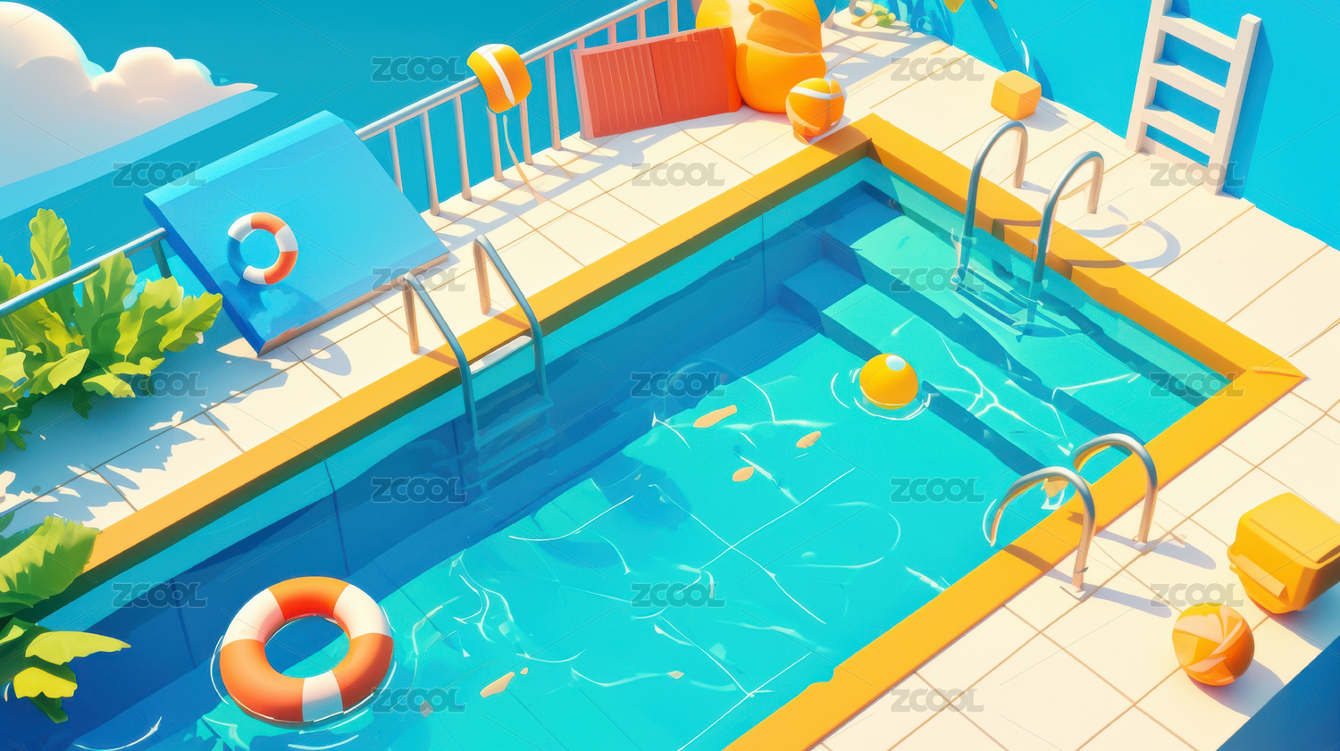 夏天白天阳光下游泳池遮阳伞沙滩椅3D插画