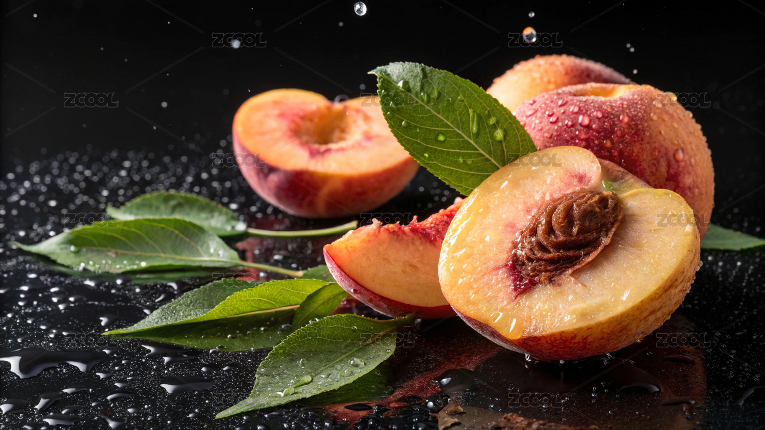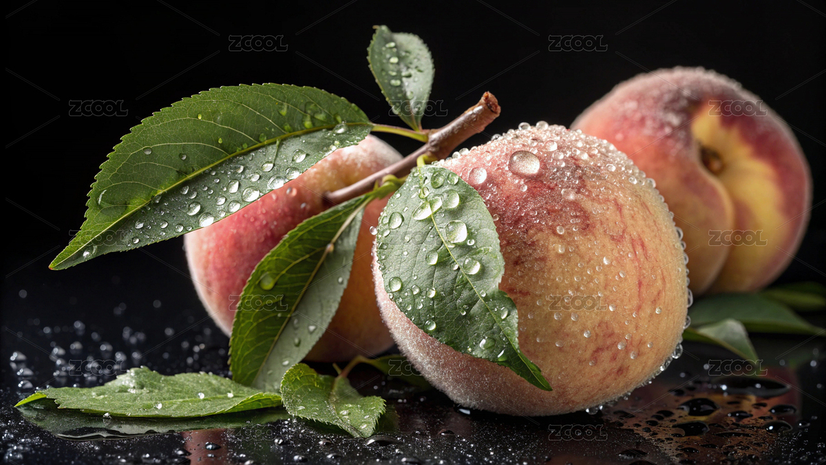 水蜜桃,桃子,水果,绿叶,水珠,新鲜,果实,成熟,饱满,色泽