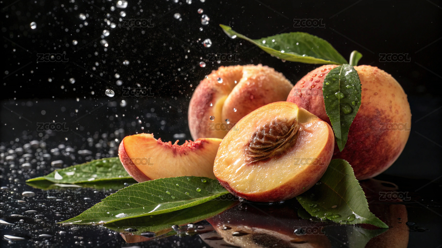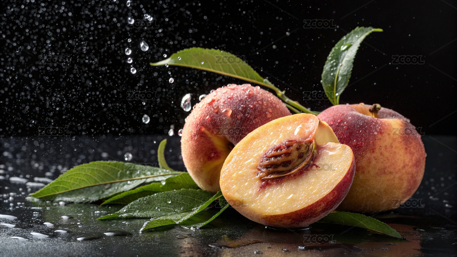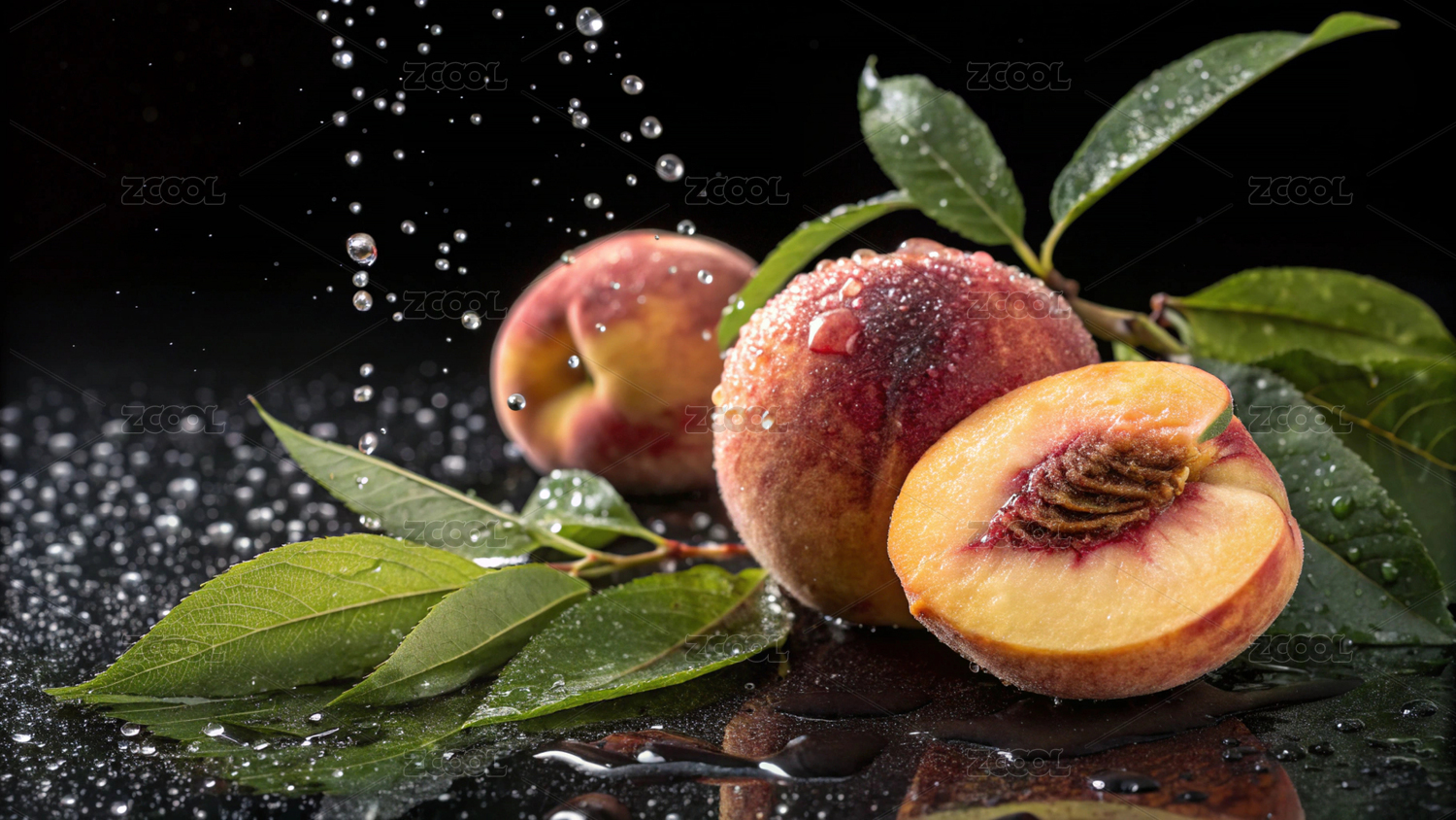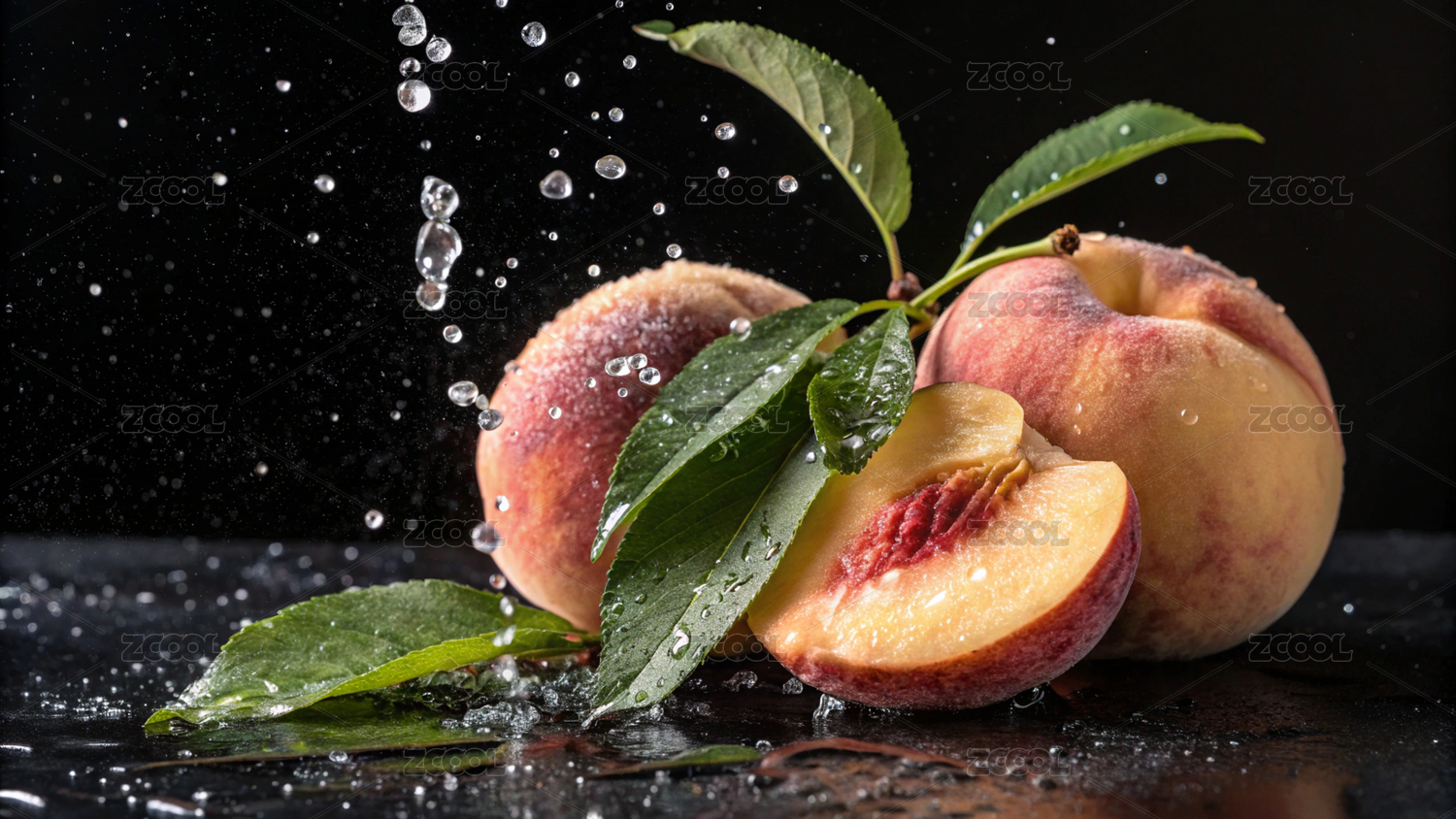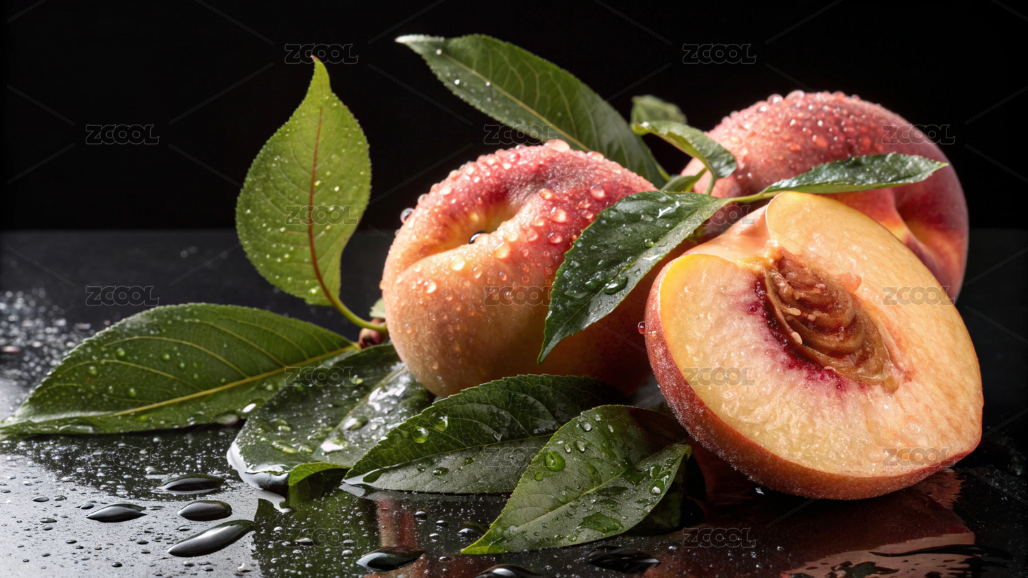 水蜜桃,桃子,水果,绿叶,水珠,新鲜,果实,成熟,饱满,色泽
