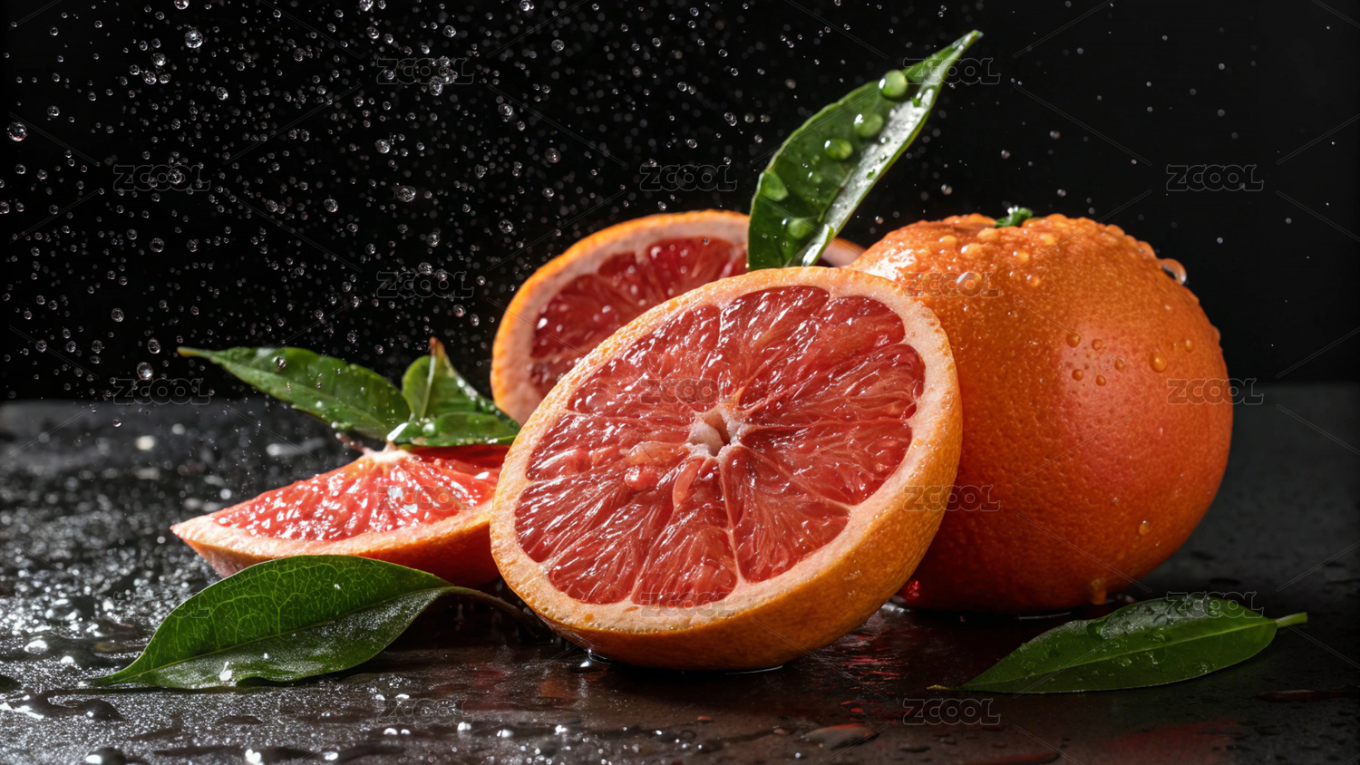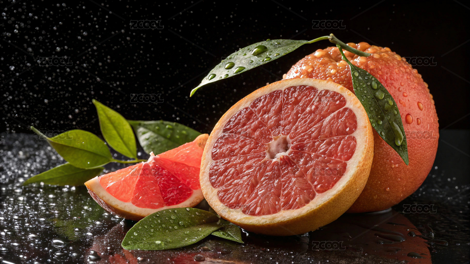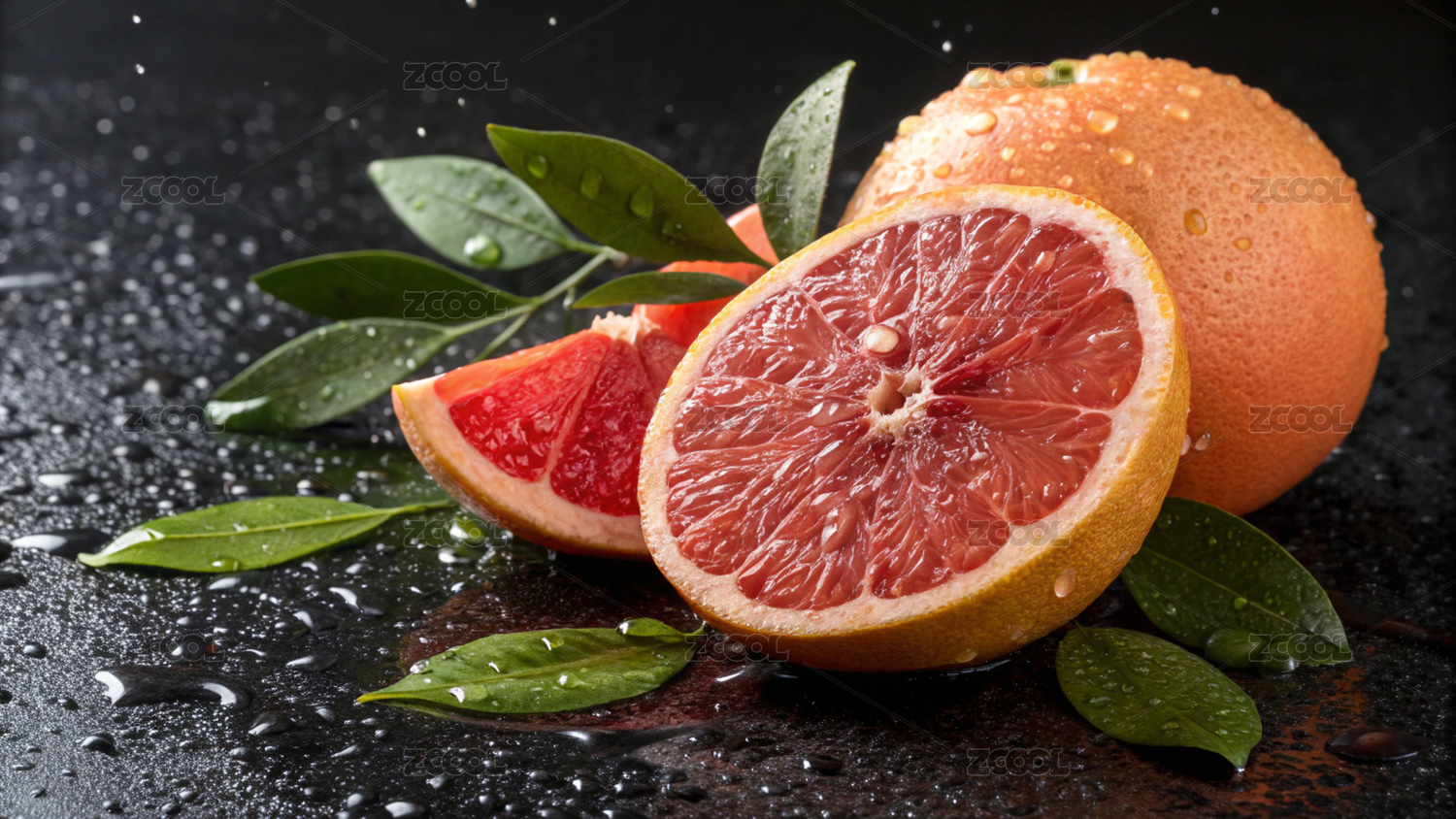葡萄柚,水果,多汁,切片,水珠,带叶,红色果肉,新鲜,西柚,果肉