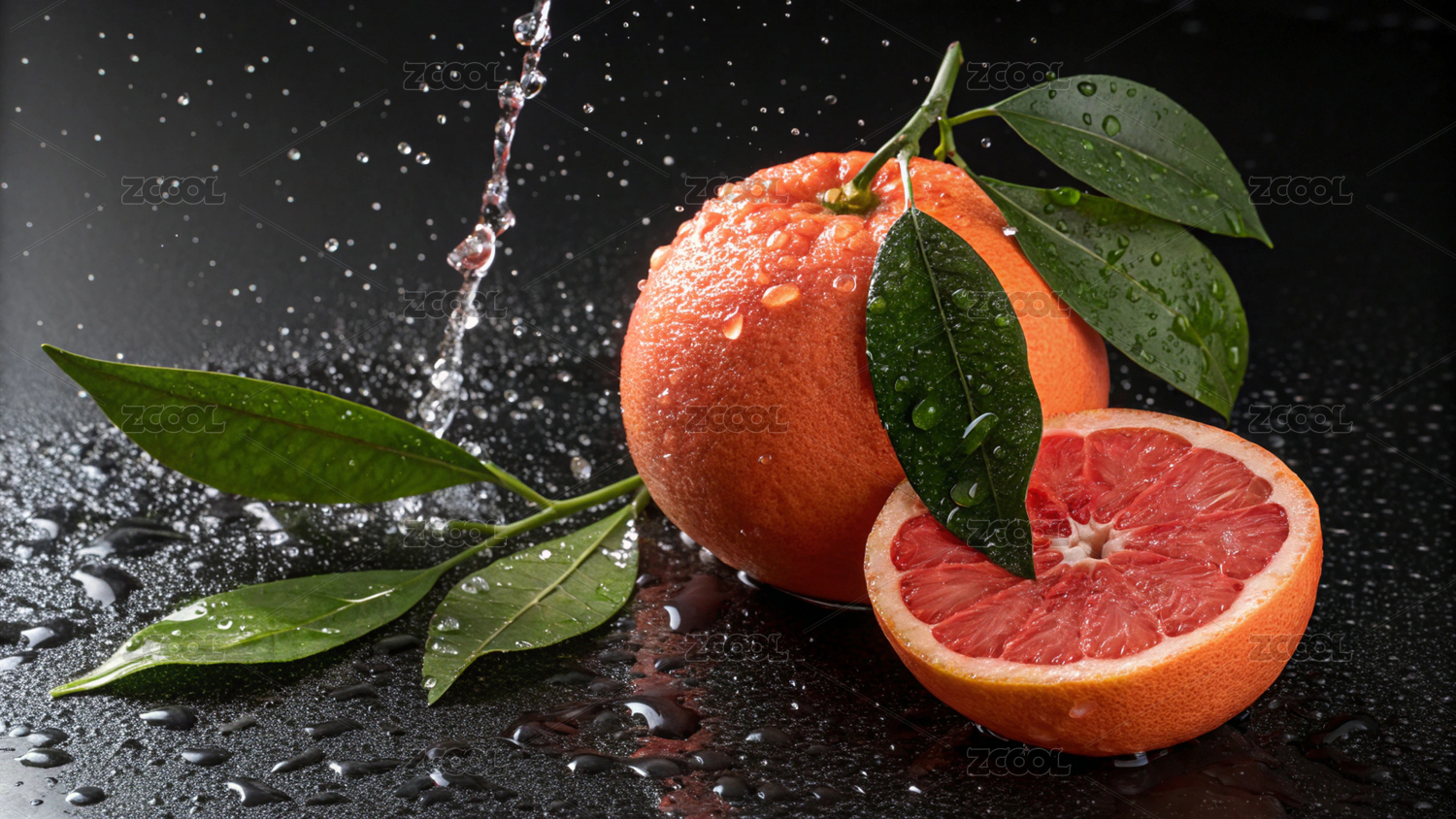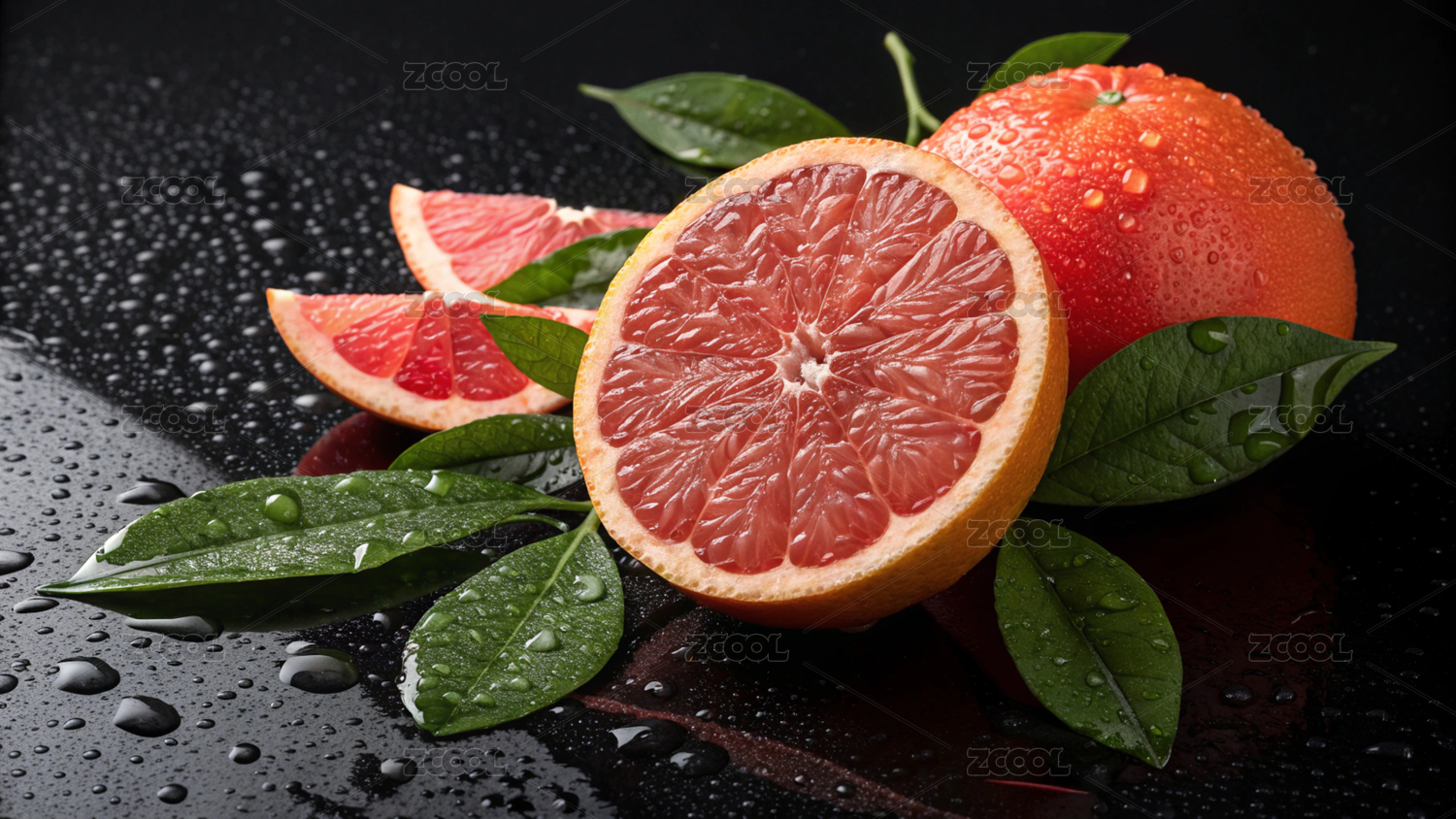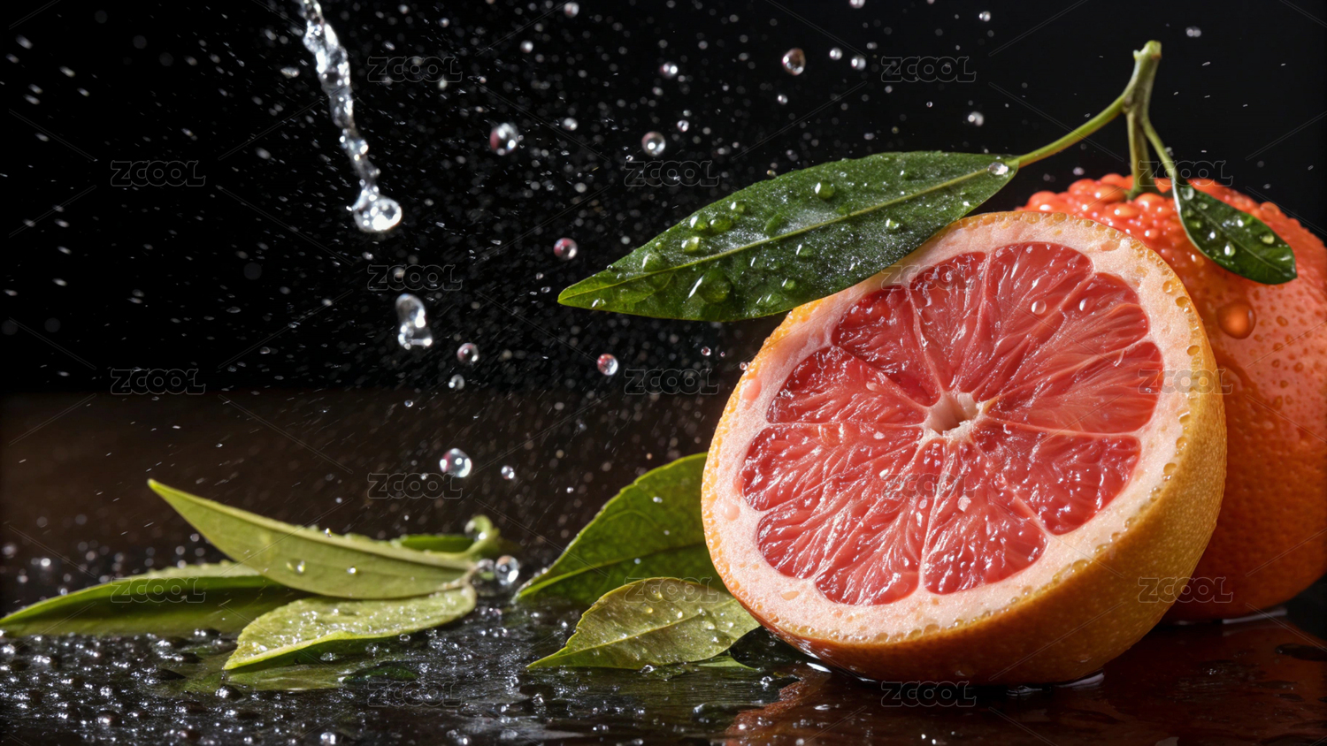 葡萄柚,水果,多汁,切片,水珠,带叶,红色果肉,新鲜,西柚,果肉