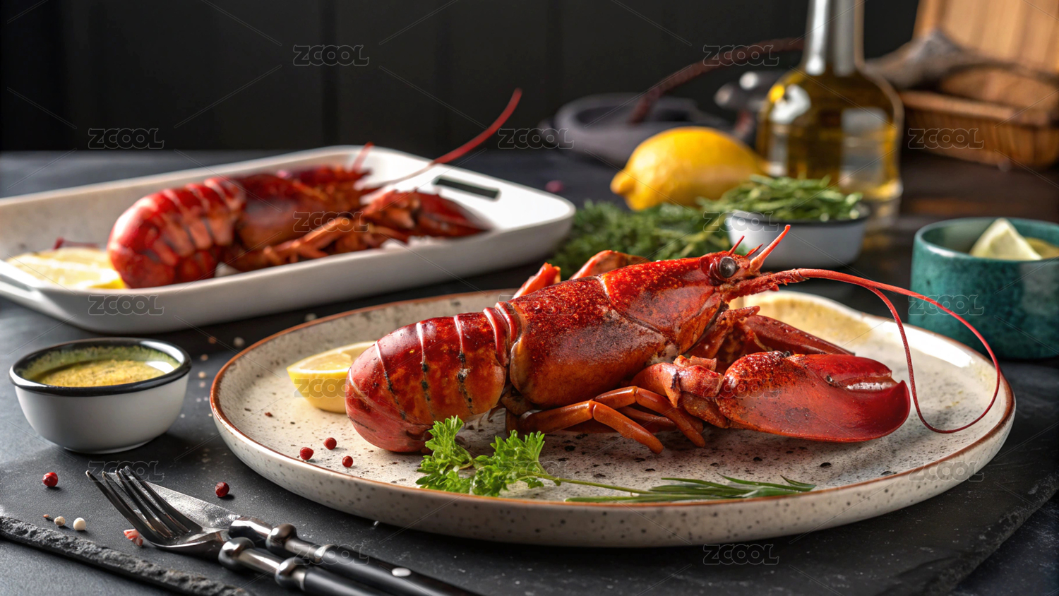 龙虾,美食,西餐,焗龙虾,香草,摆盘,餐具,柠檬,海鲜,菜肴