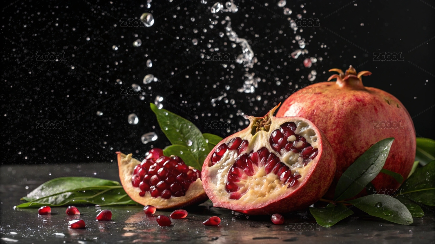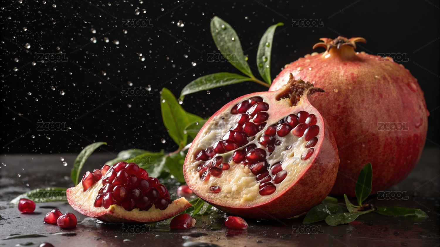 石榴,水果,水珠,绿叶,红色果实,果实,切开,果肉,籽,生鲜