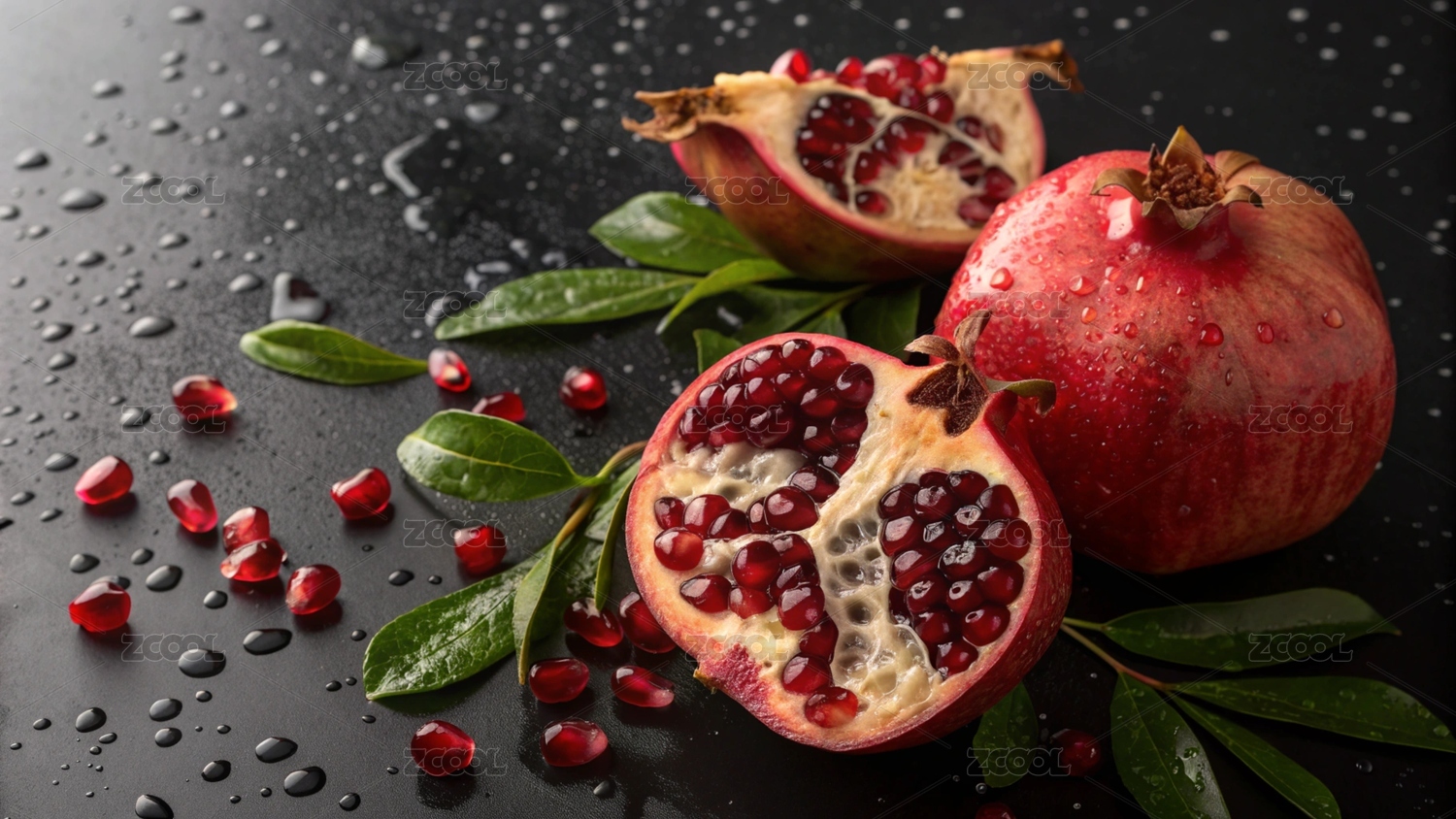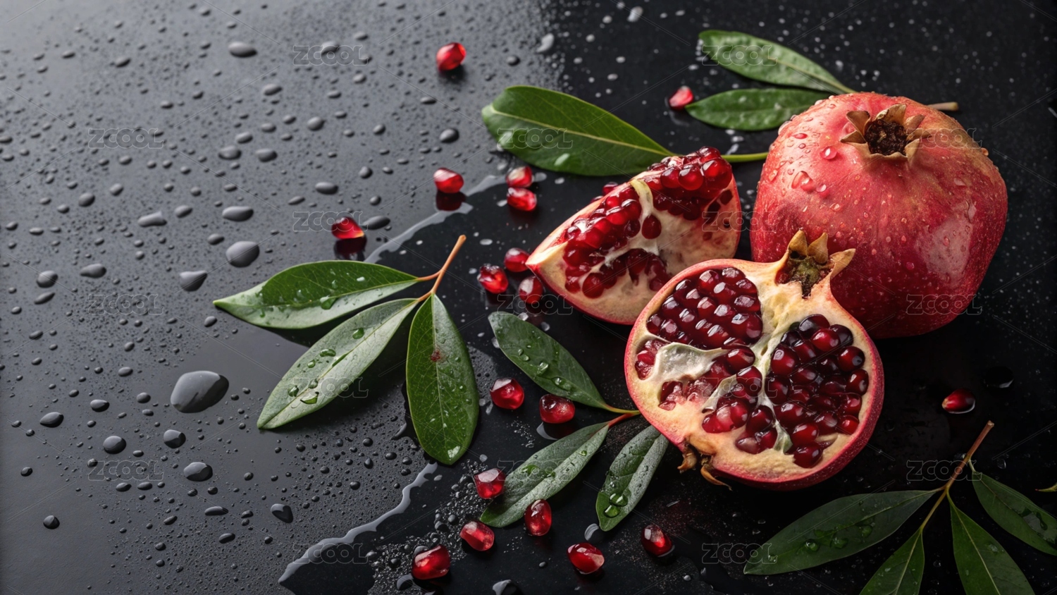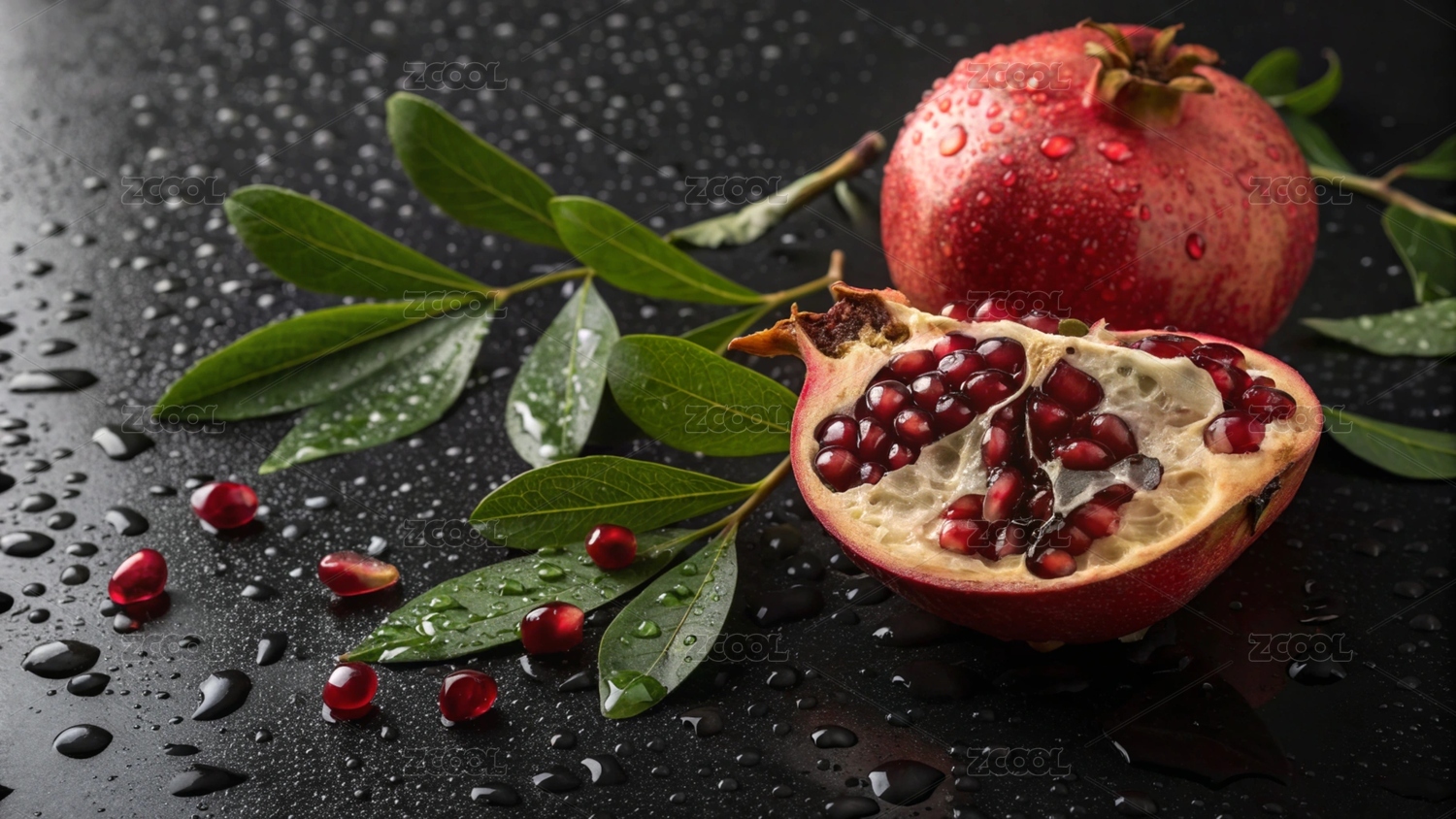 石榴,水果,水珠,绿叶,红色果实,果实,切开,果肉,籽,生鲜