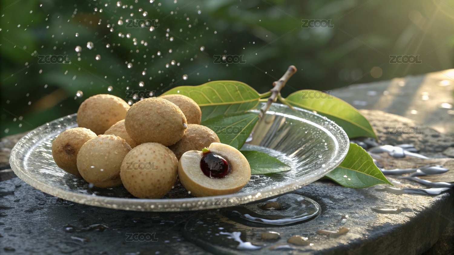 龙眼,水珠,新鲜水果,枝叶,果枝,果实,叶子,带壳,剥开,果肉