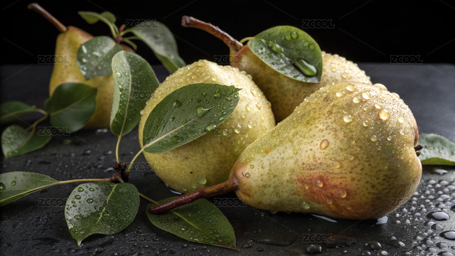 梨子,水珠,绿叶,新鲜,水果,静物,摄影,自然,质感,光影