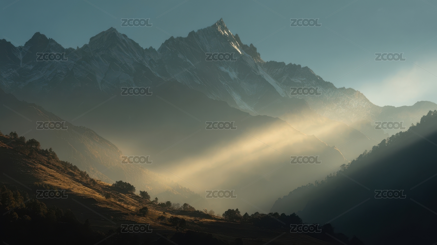 晨光穿透山谷山峰巍峨