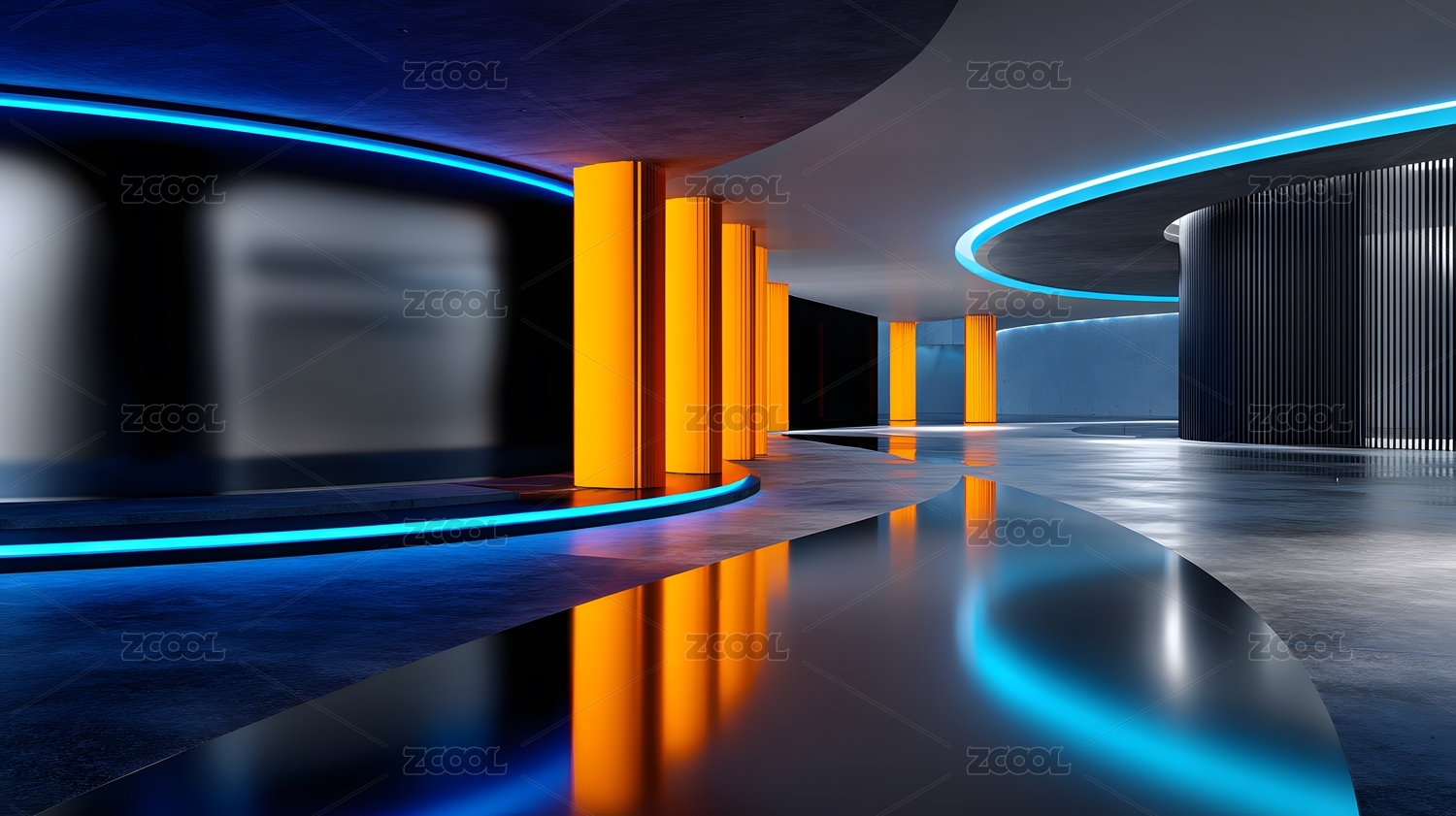 科技,蓝色,空间,线条,橙色,灯光,走廊,地面,通道,现代