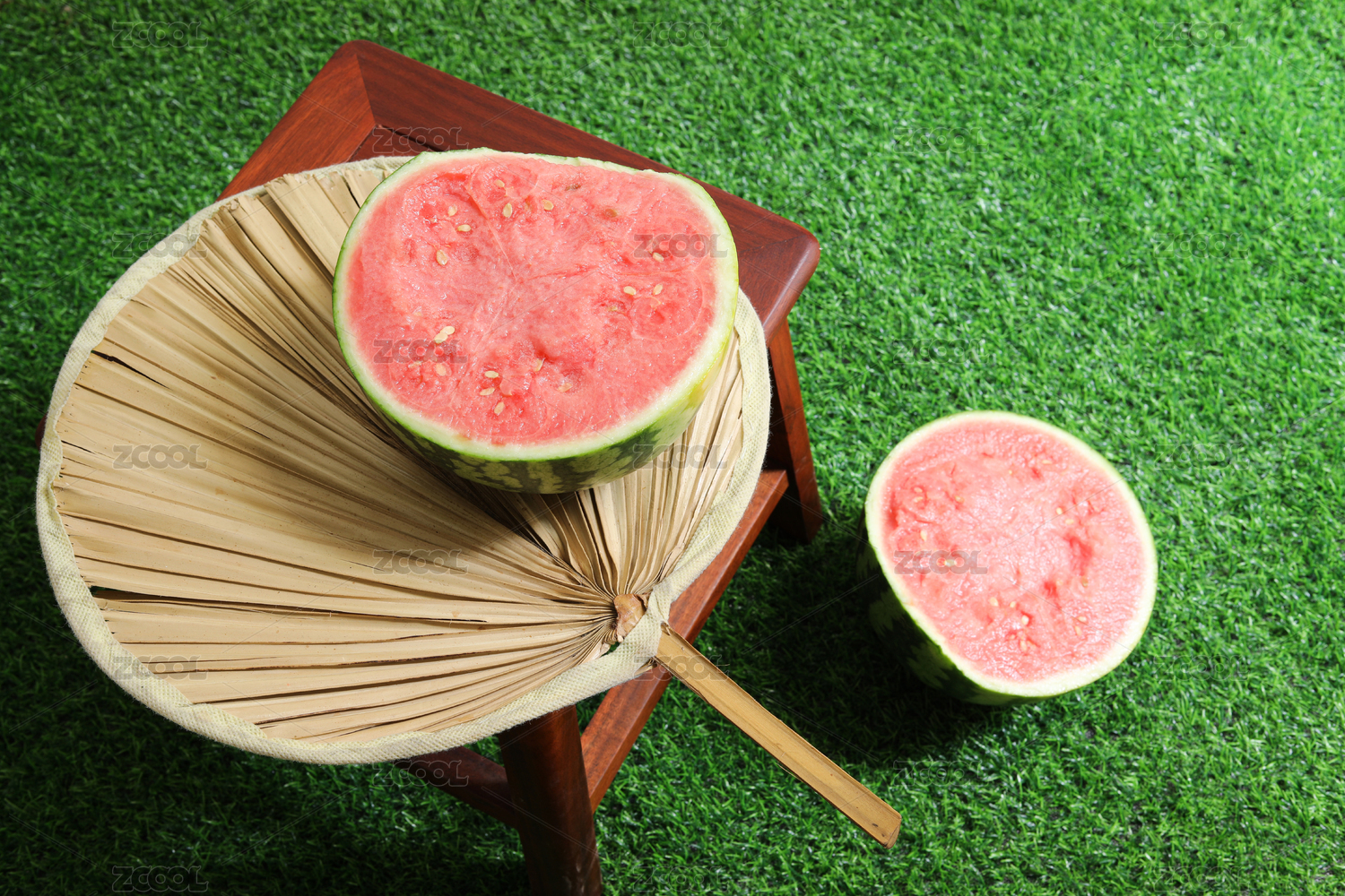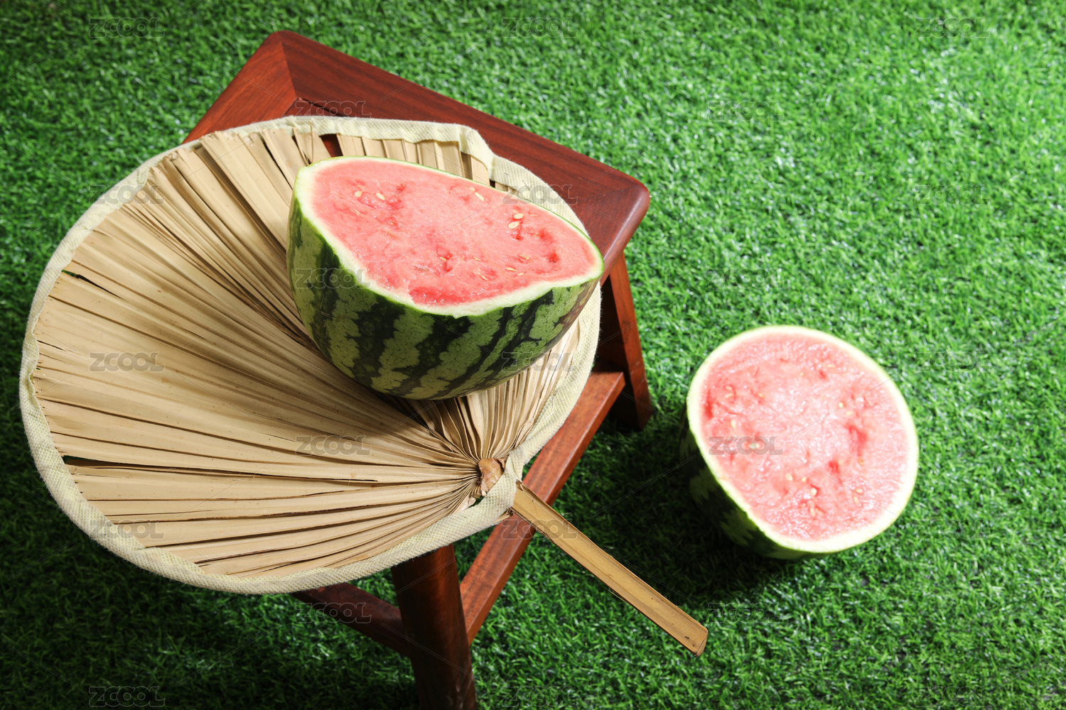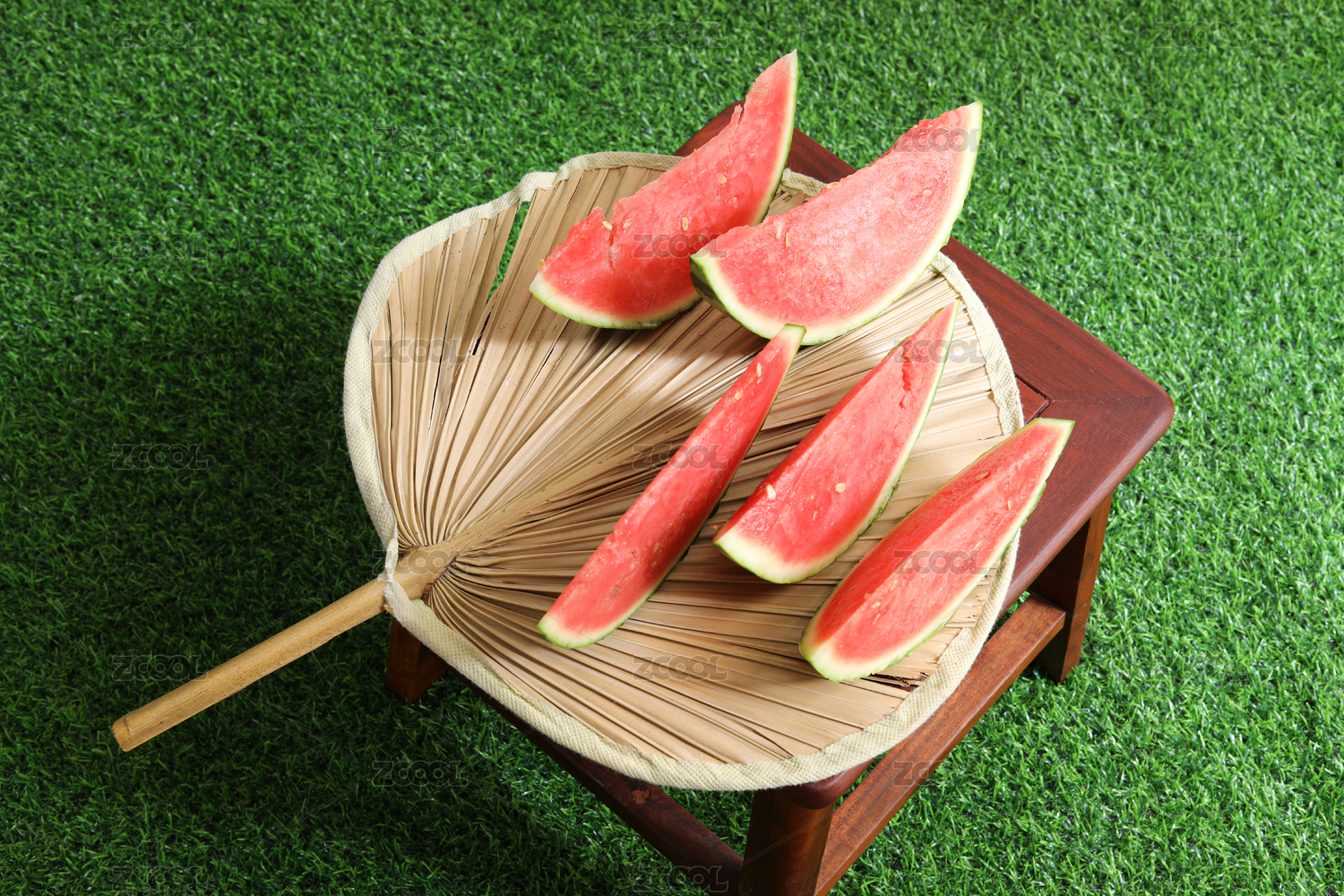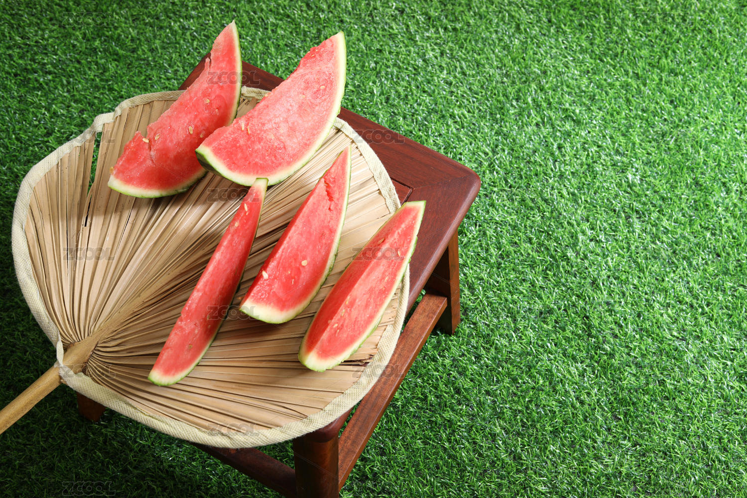 西瓜,蒲扇,夏天,美食,草地,草坪,绿色,色彩,阳光,扇子