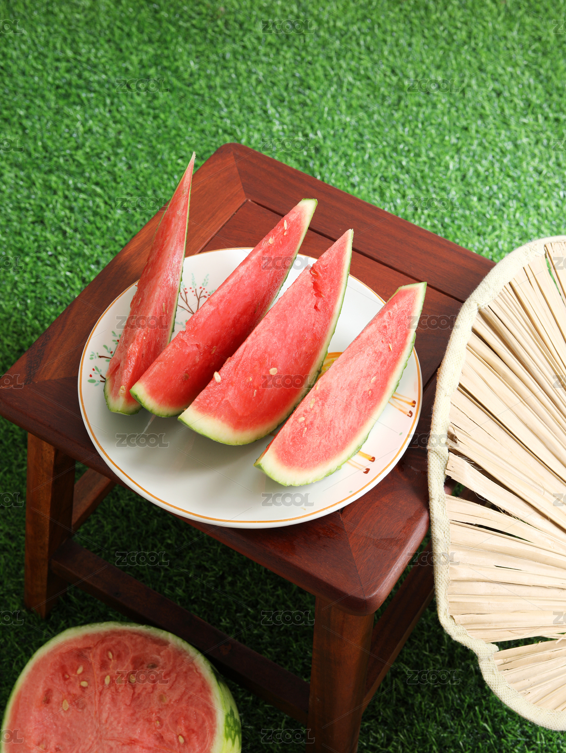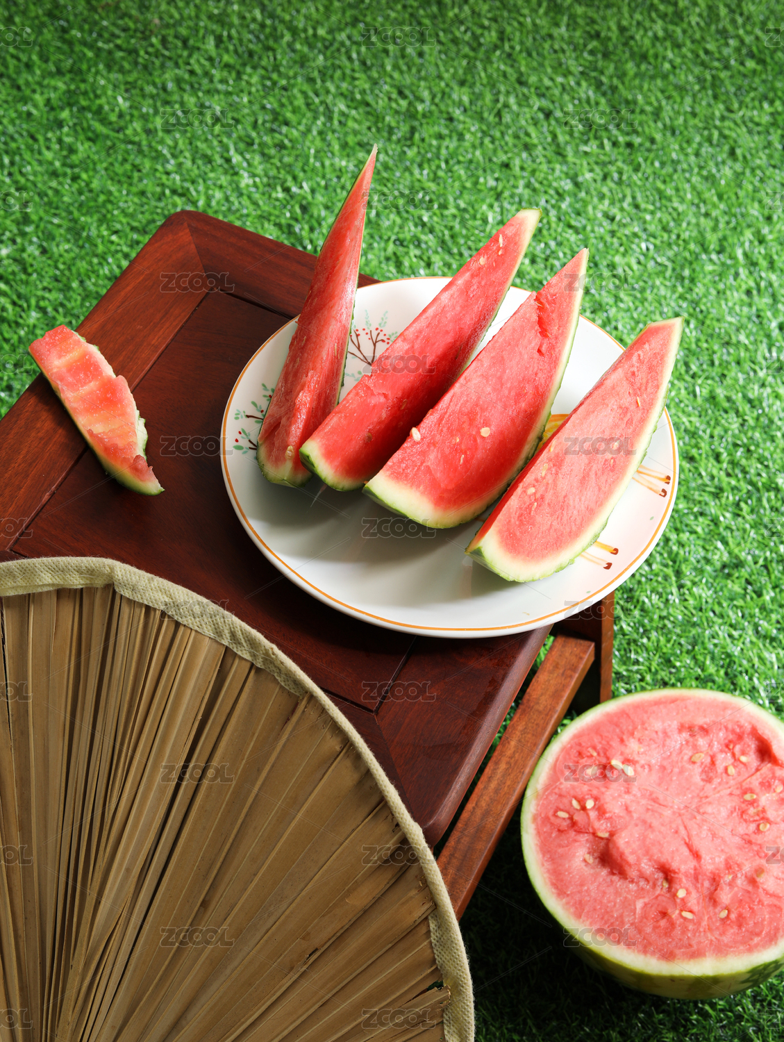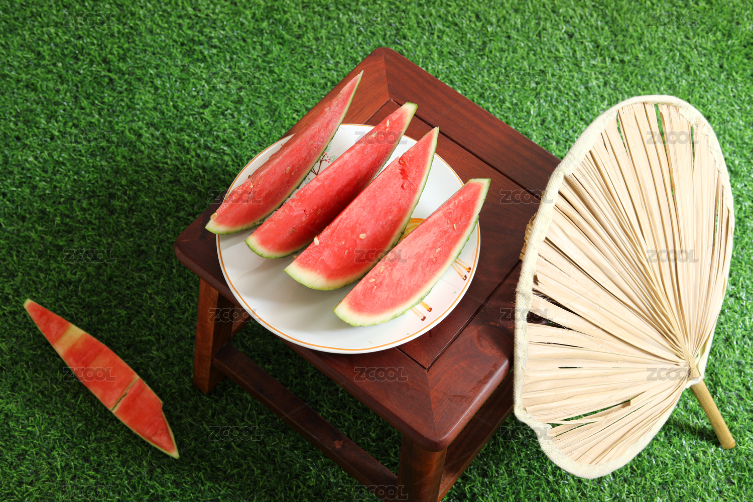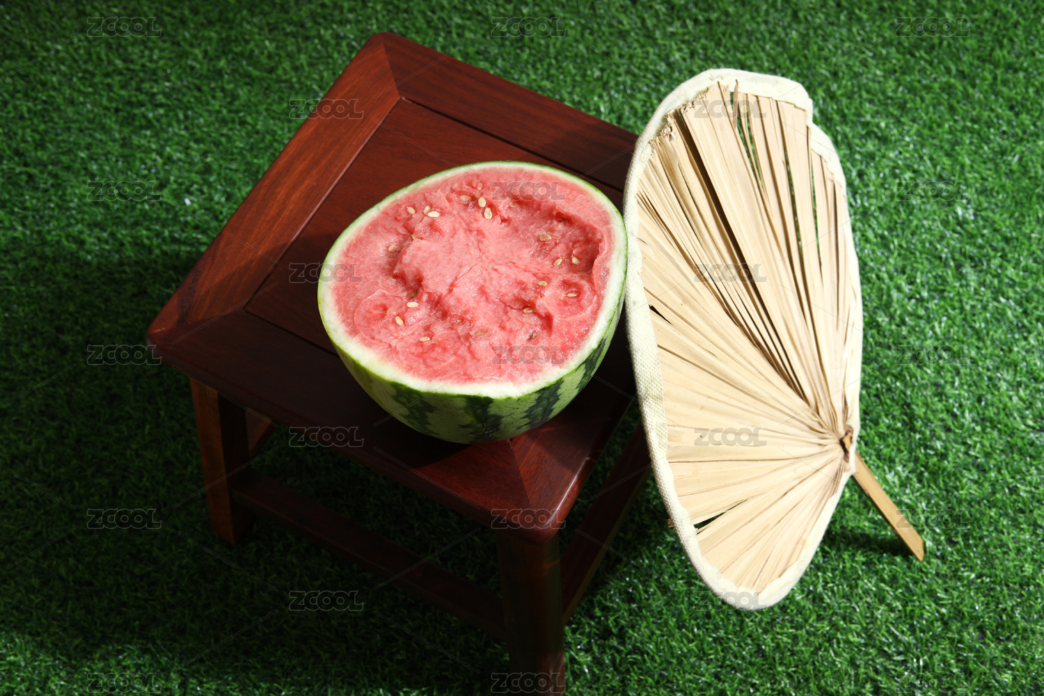 西瓜,蒲扇,夏天,美食,草地,草坪,绿色,色彩,阳光,扇子