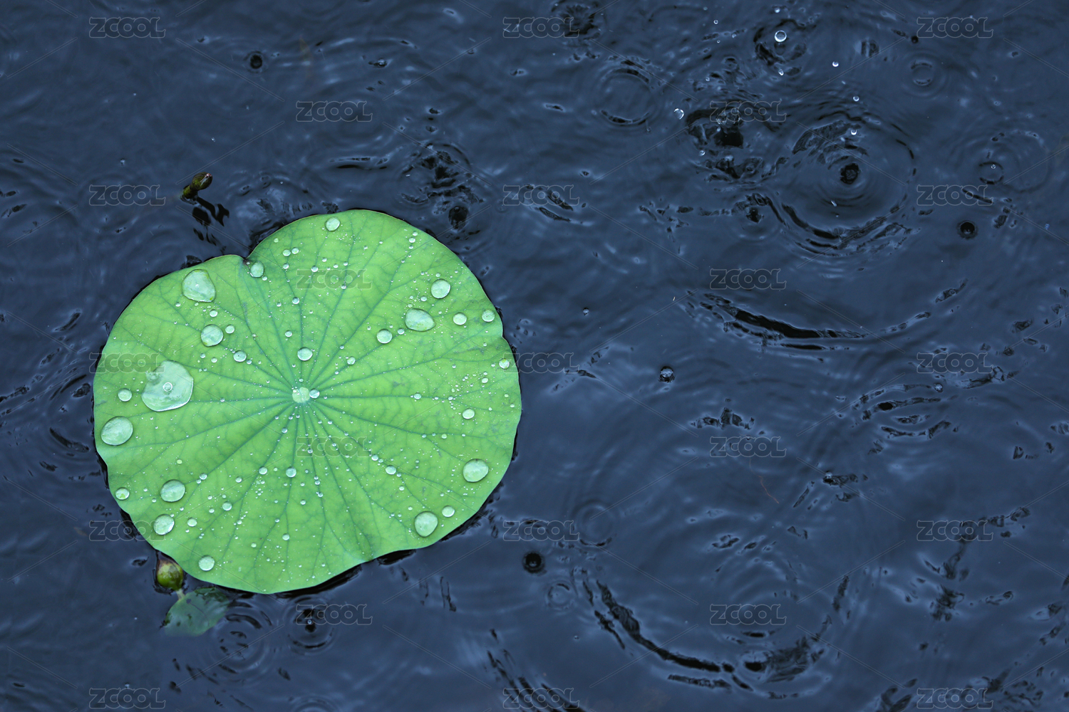 夏天池塘中的绿色荷叶叶子和上面的雨滴水珠