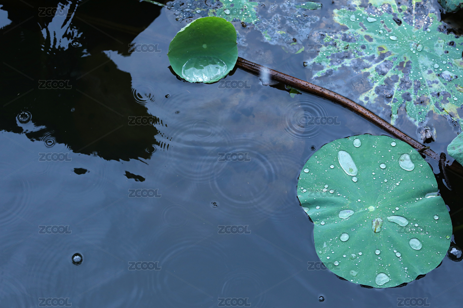 夏天池塘中的绿色荷叶叶子和上面的雨滴水珠