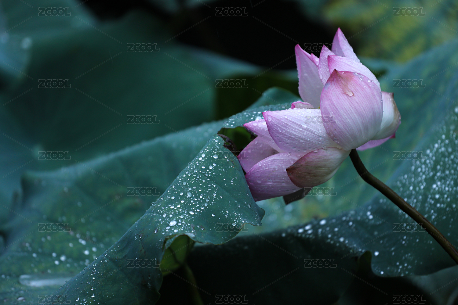 夏日荷塘里荷花盛开、花苞、莲蓬和莲叶水珠