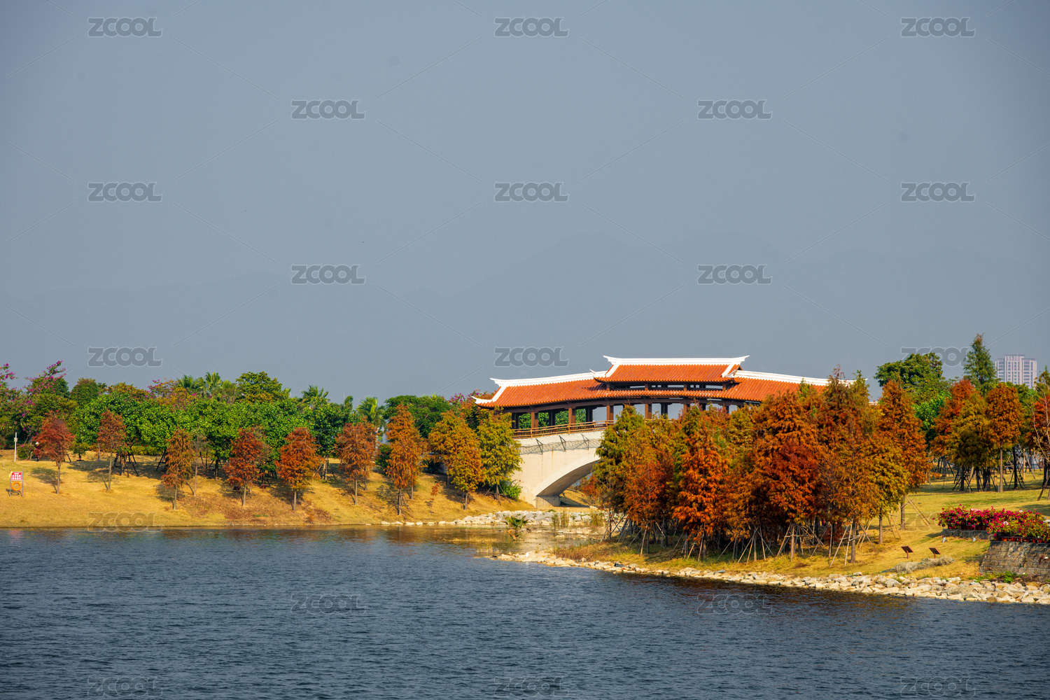 福建厦门马銮湾公园湖畔秋景与中式拱桥