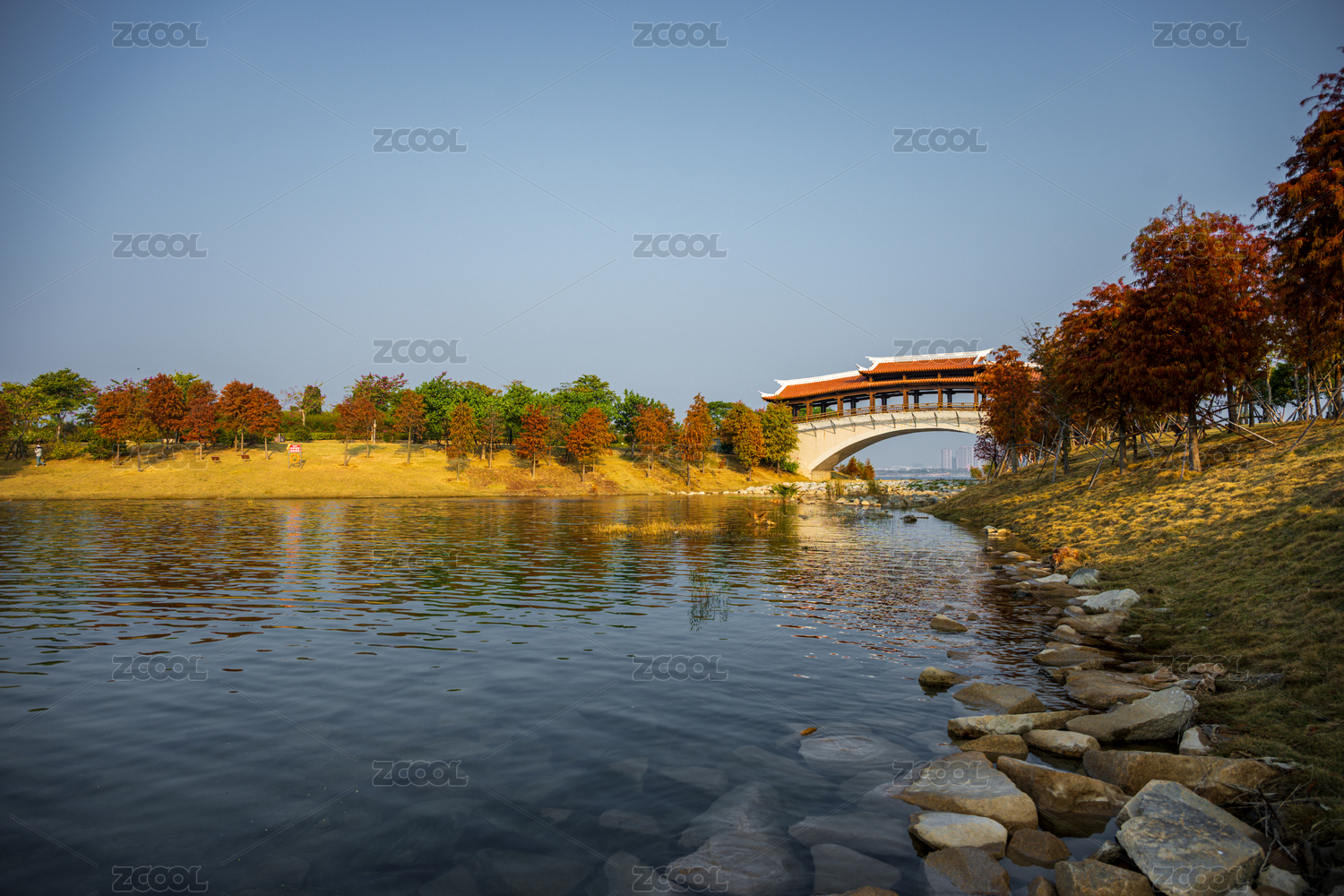 福建厦门马銮湾公园湖畔的中式拱桥与秋色