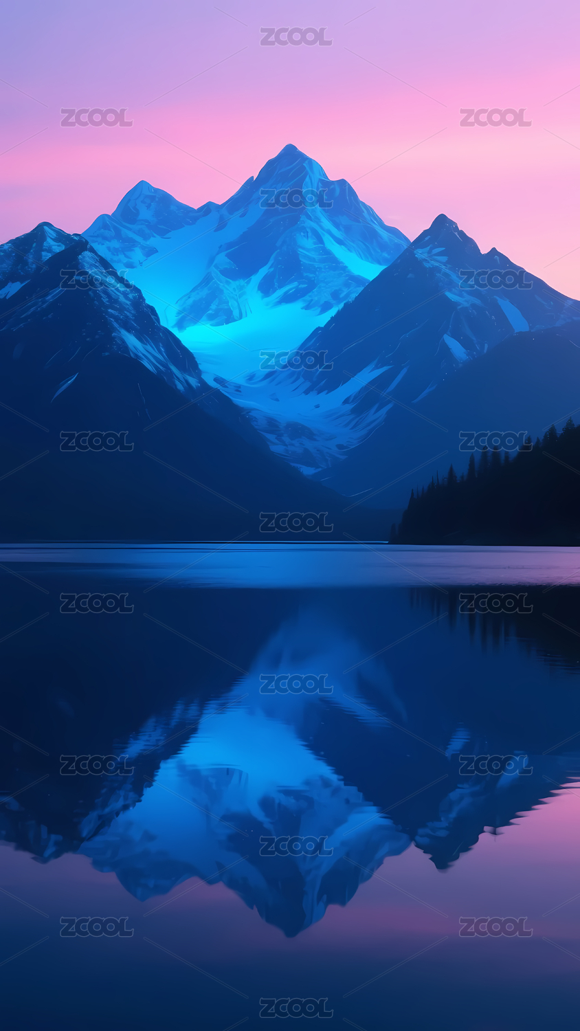 雪山湖面倒影,晨曦粉蓝天空