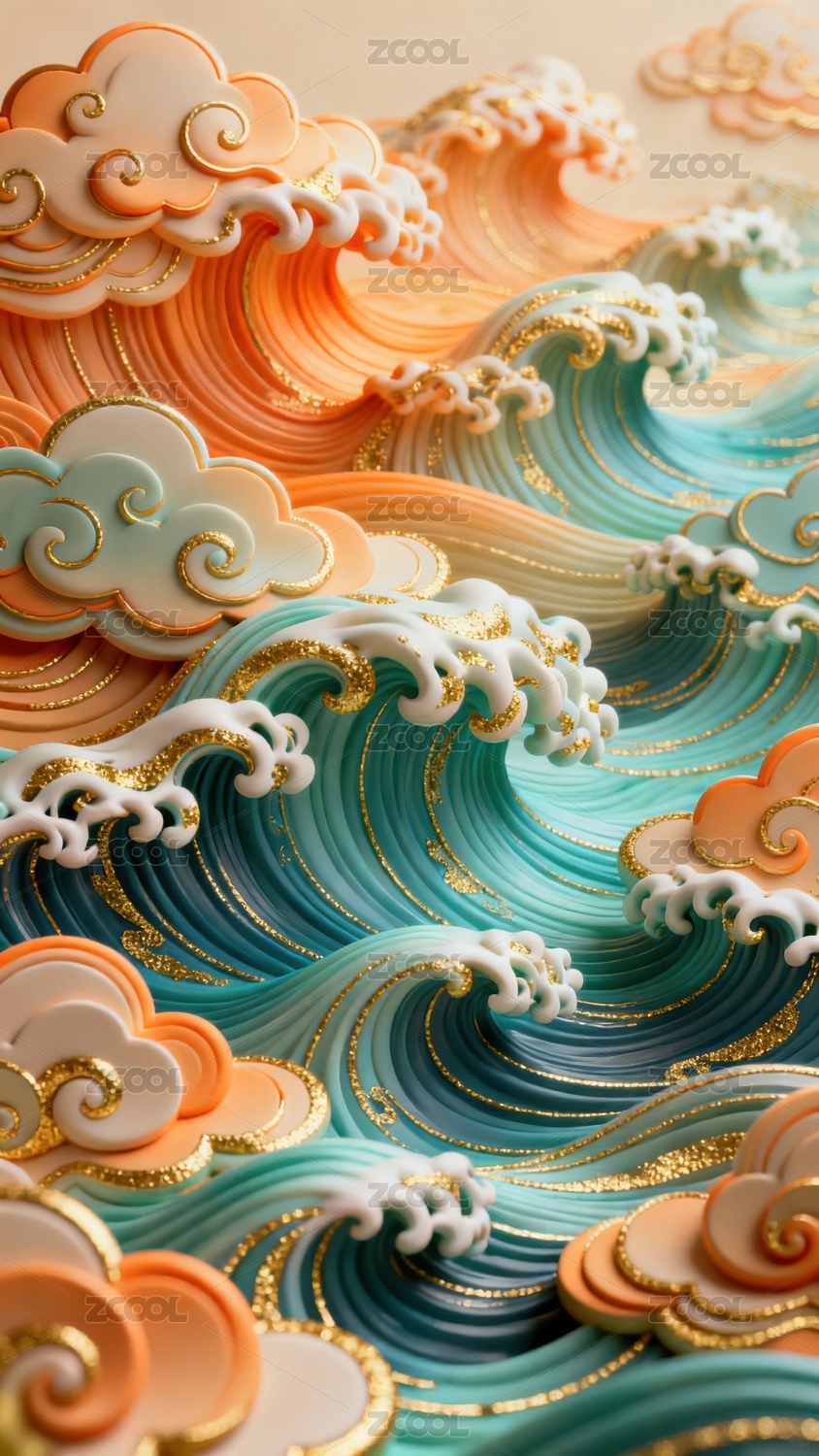 3D,立体,国风,云纹,海浪,橙色,蓝绿色,抽象,背景