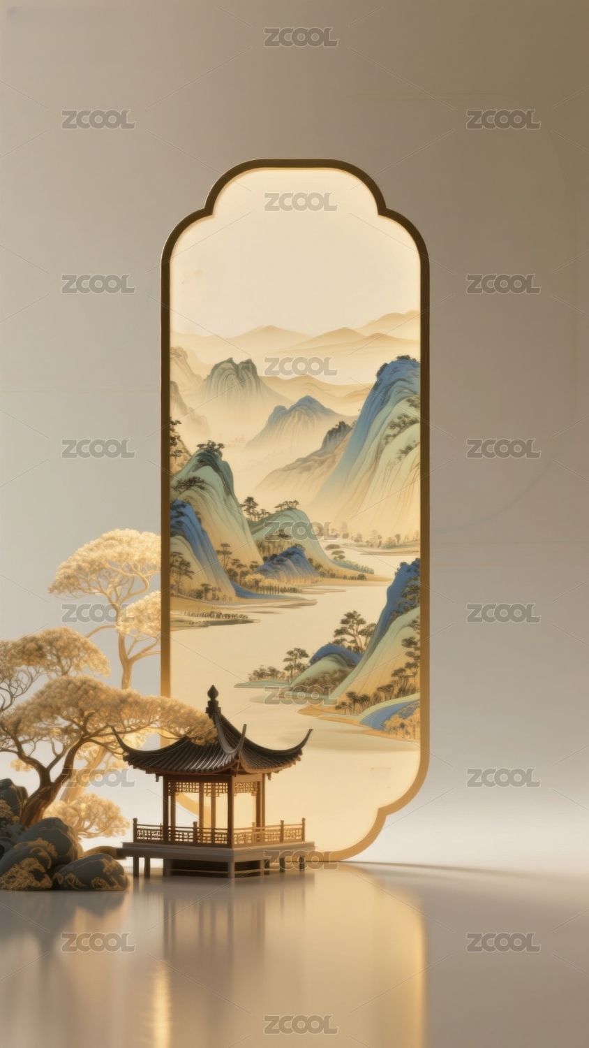 3D立体屏风山水画电商背景