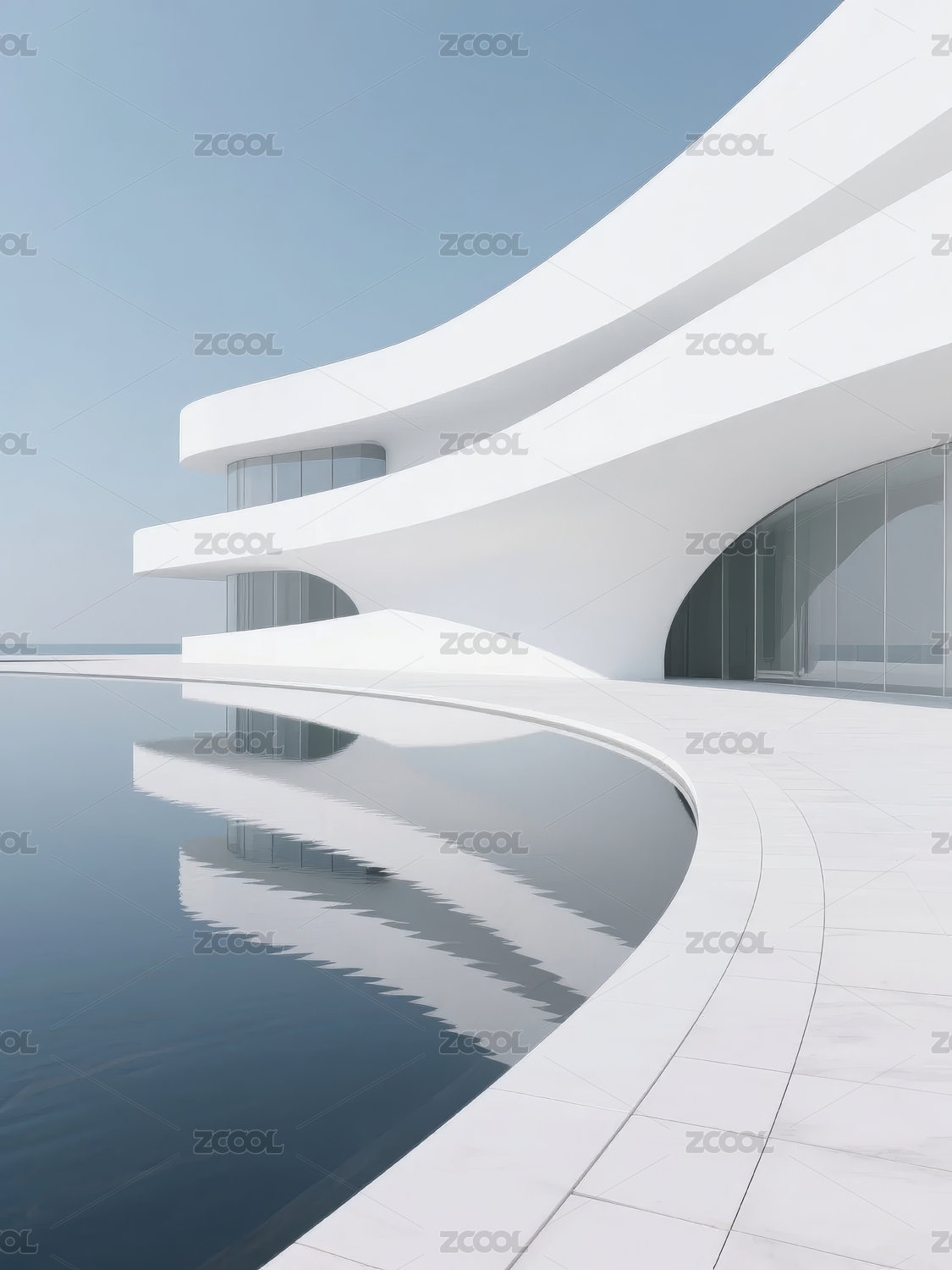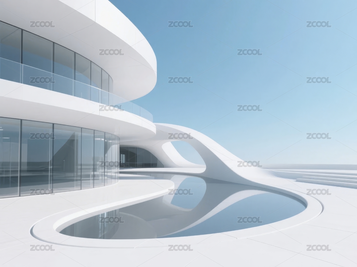 现代流线型建筑与水池