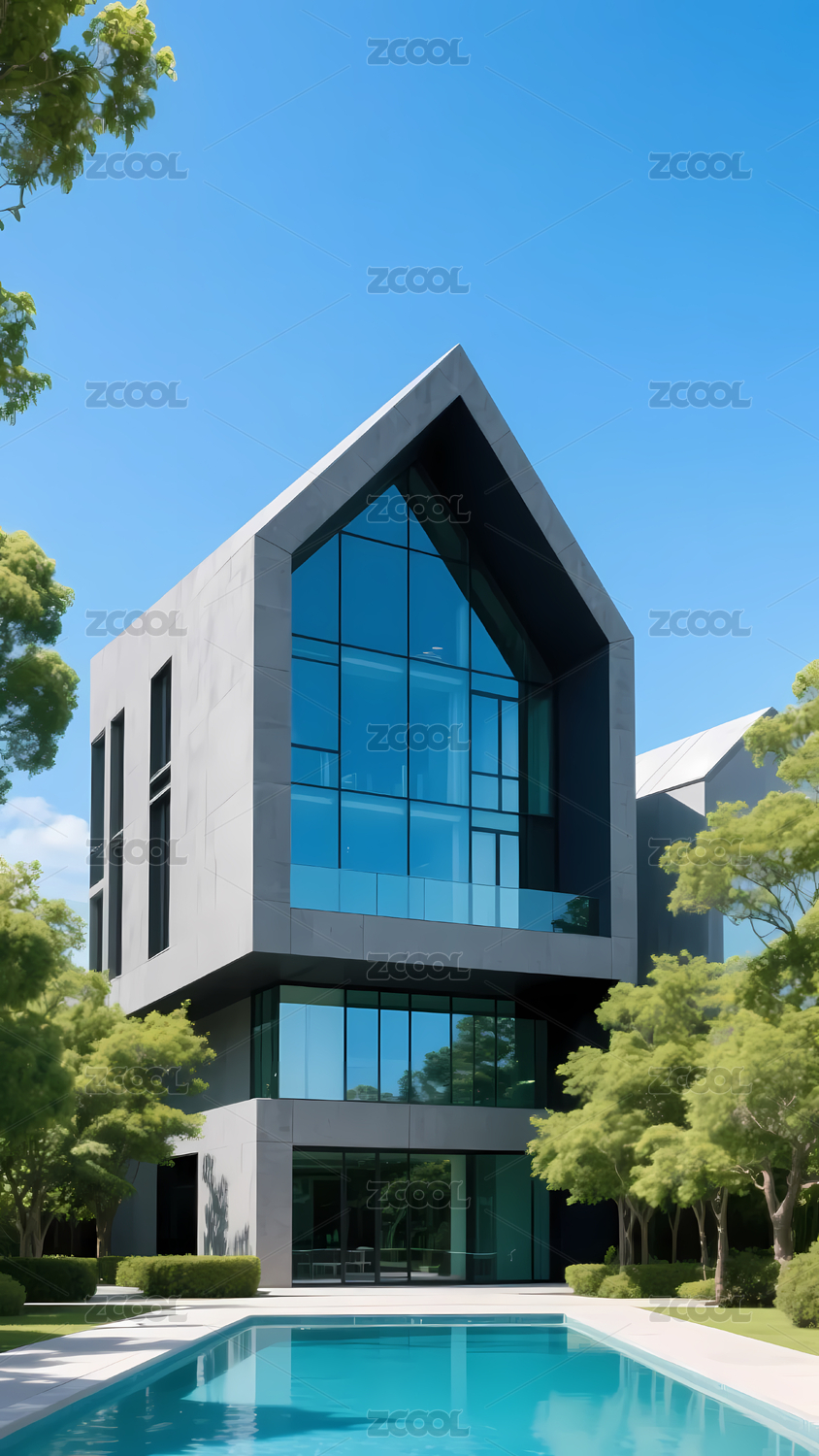 现代玻璃幕墙建筑与泳池