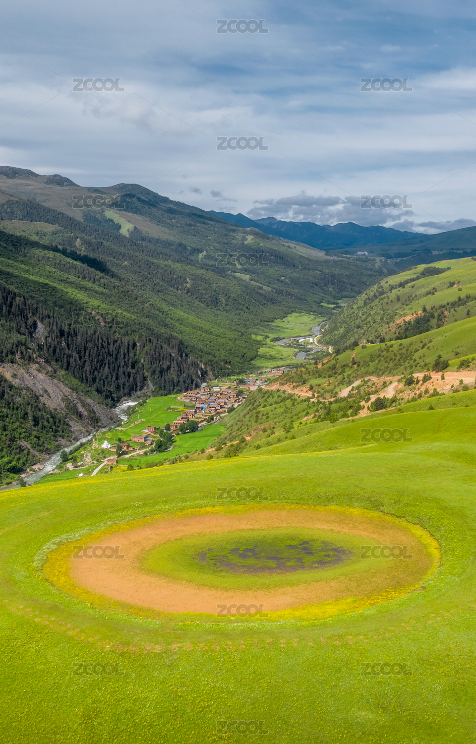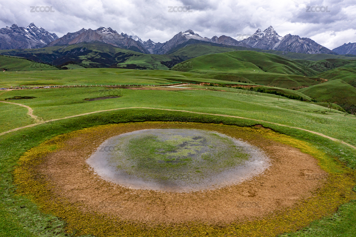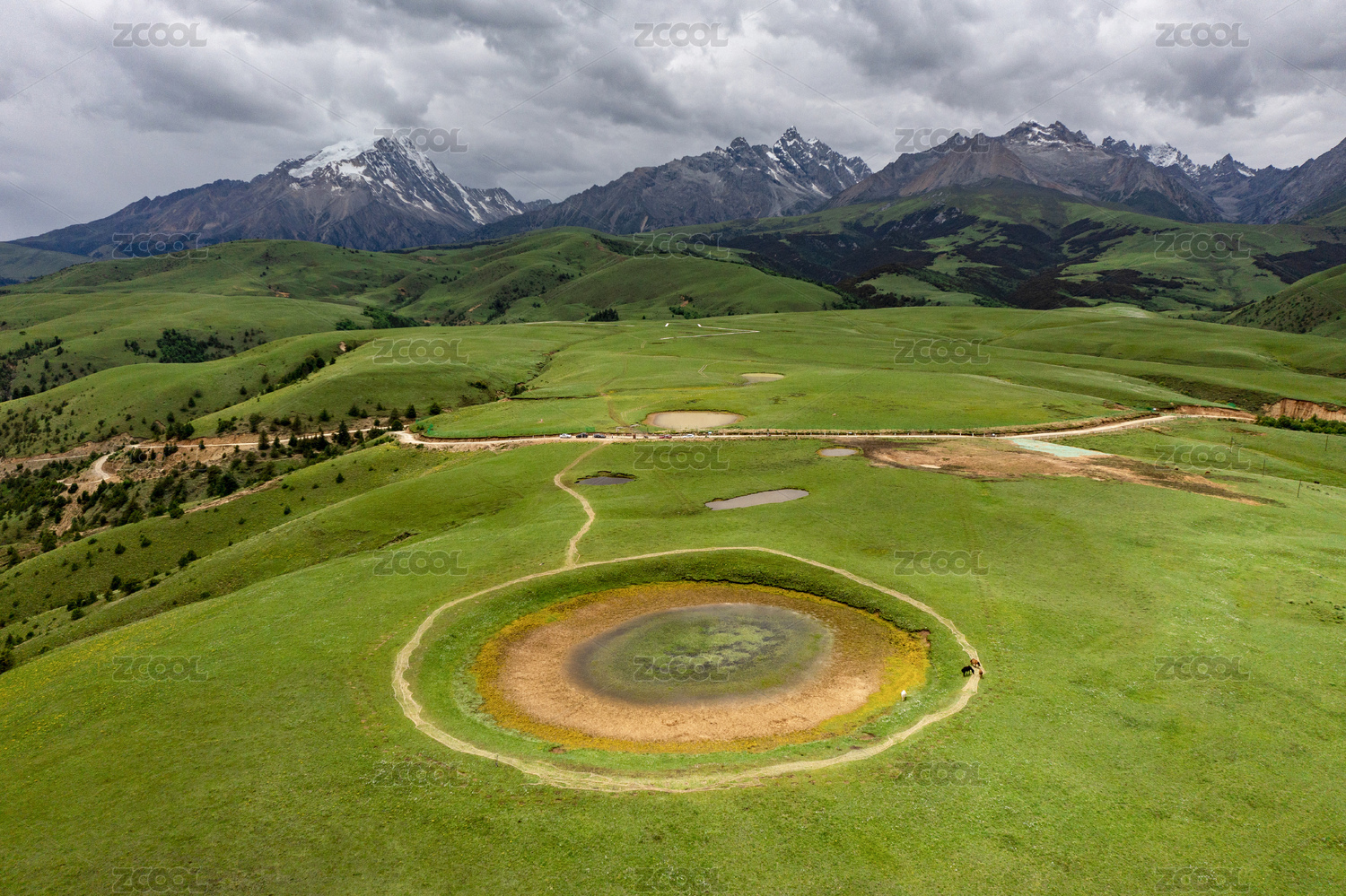 格聂之眼,格聂雪山,高山草甸,圆形地貌,自然景观,高原风光,无人机航拍,绿色,山脉,雪山