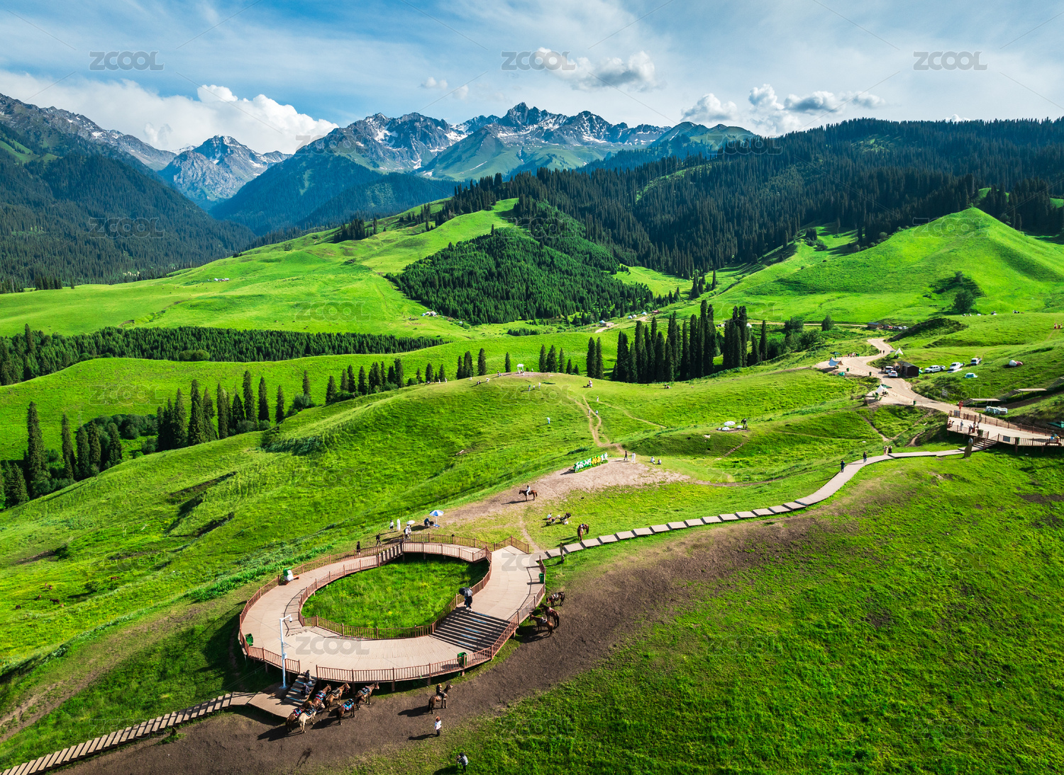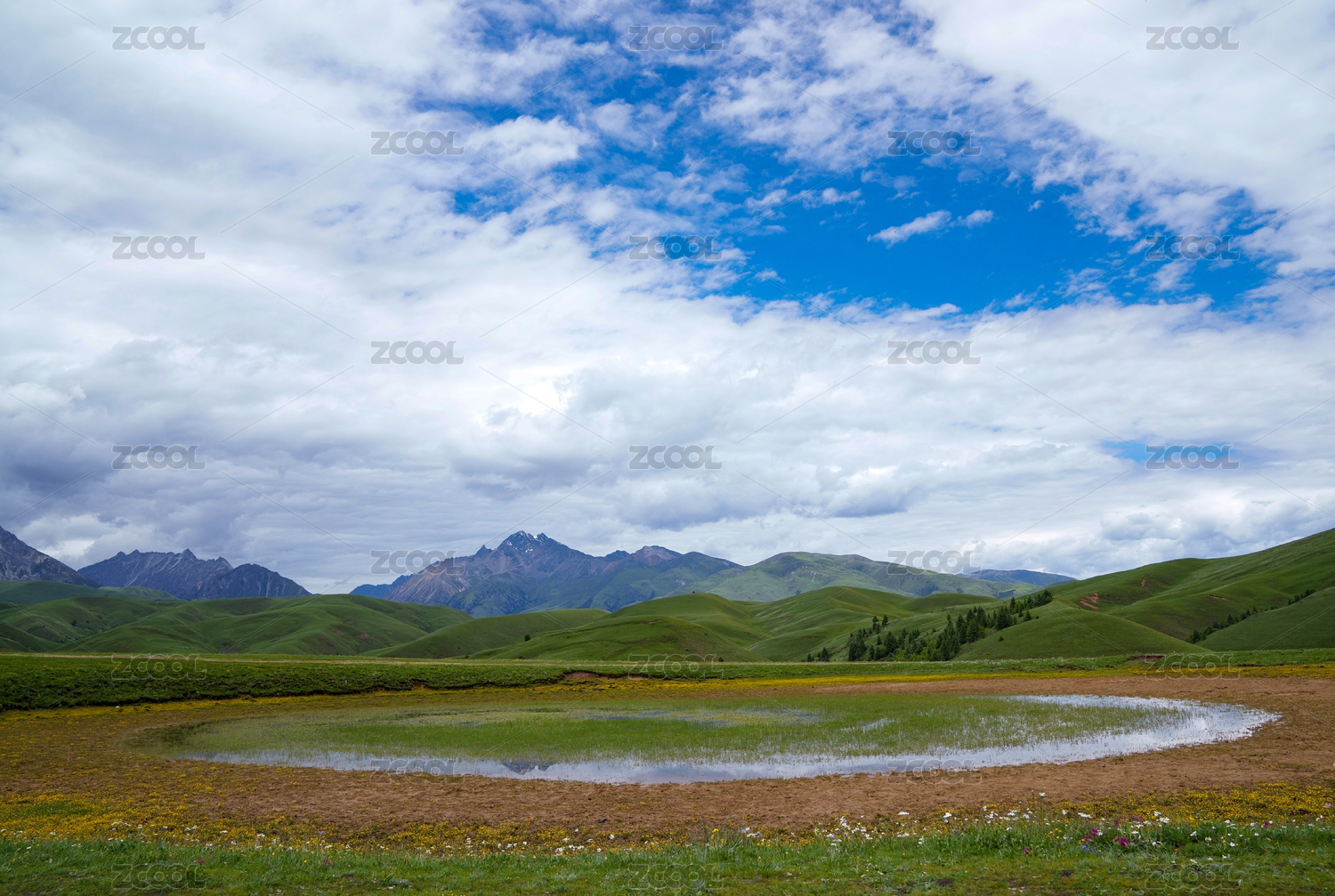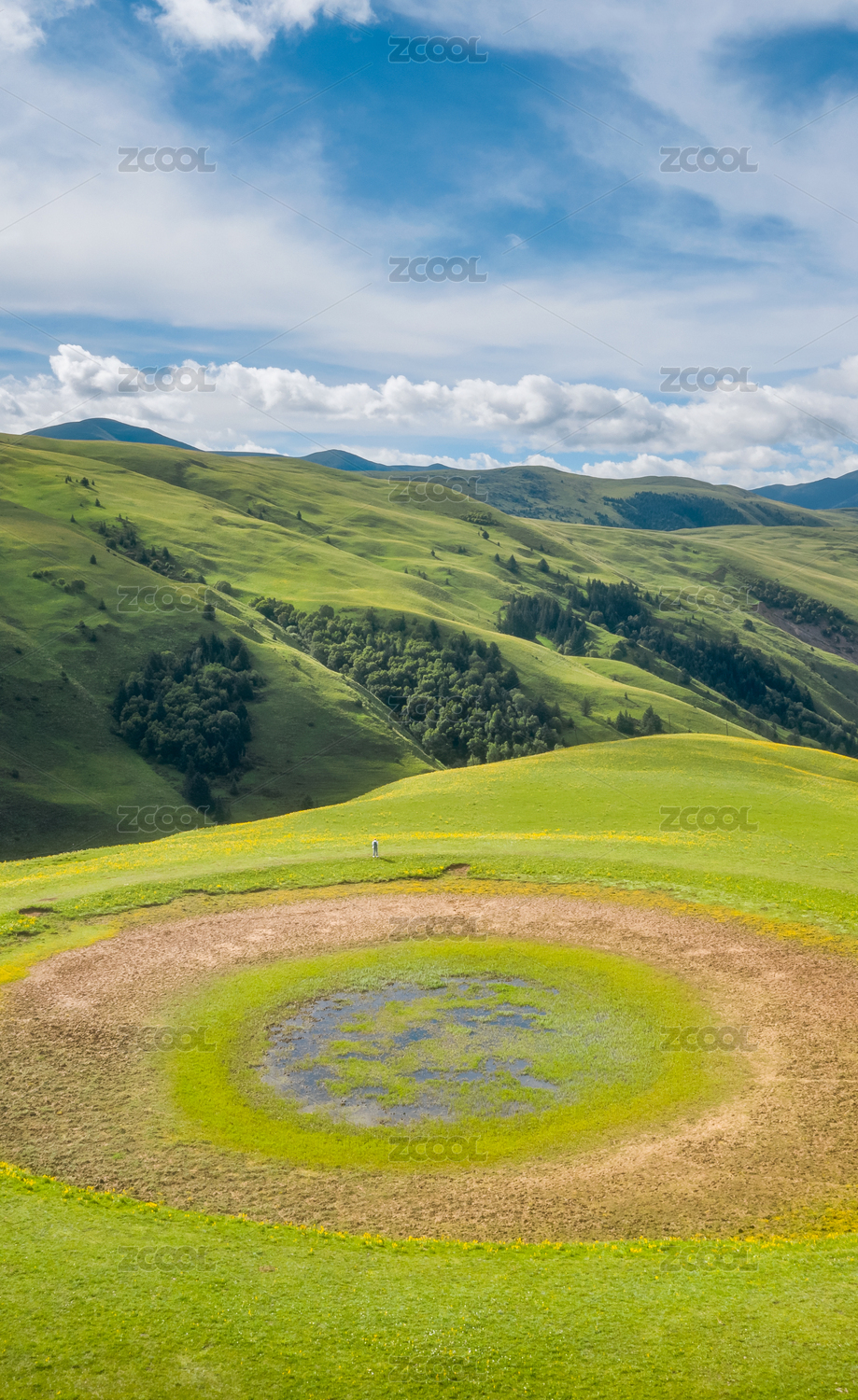 格聂之眼,格聂雪山,高山草甸,圆形地貌,自然景观,高原风光,无人机航拍,绿色,山脉,雪山