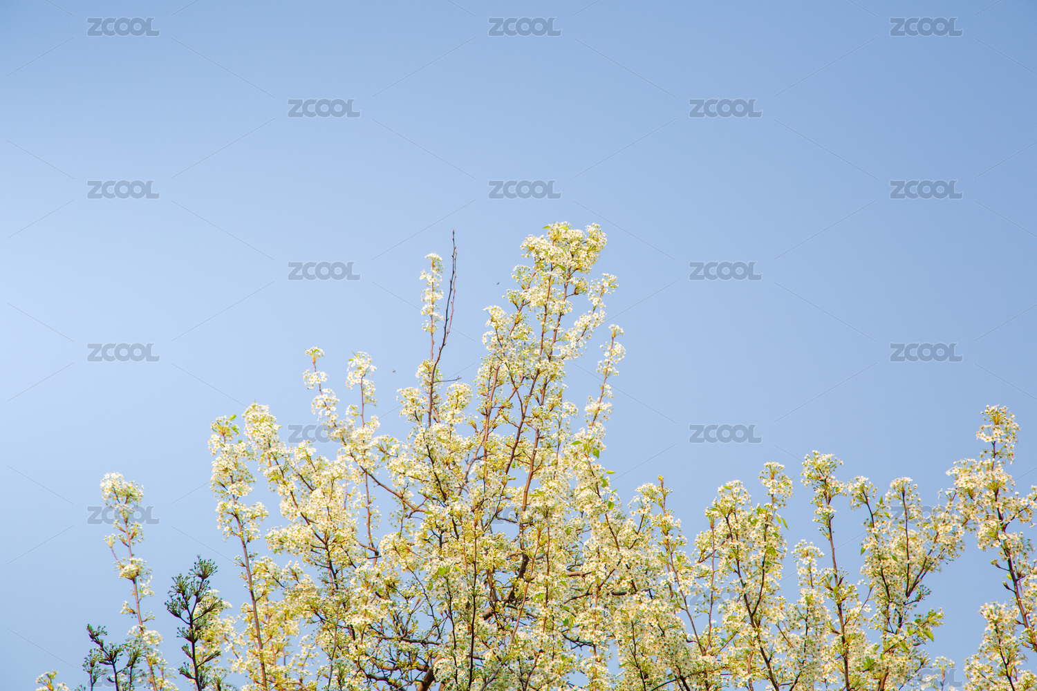 蓝天下的白色花树