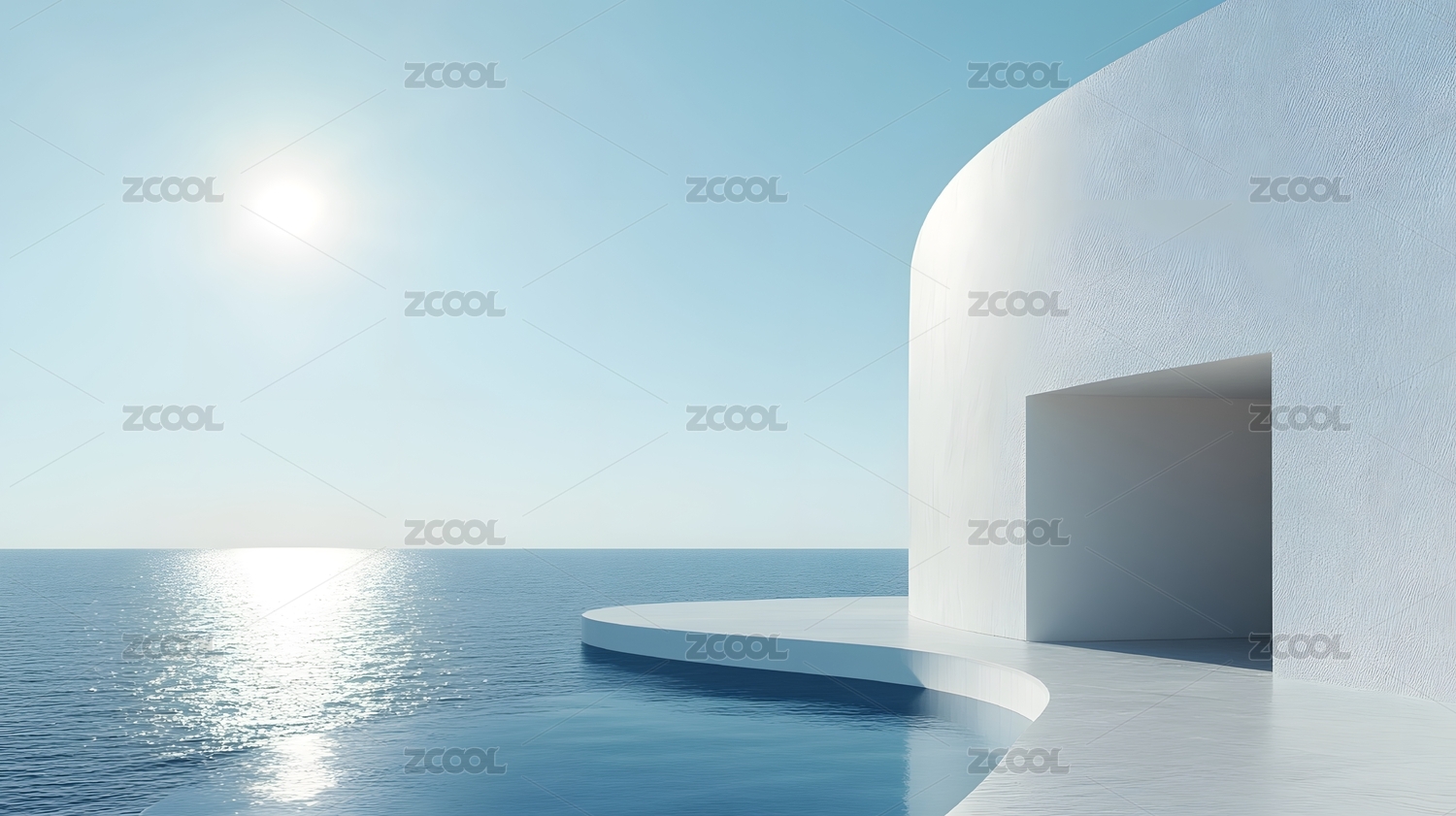 纯白镜面海滨建筑空间
