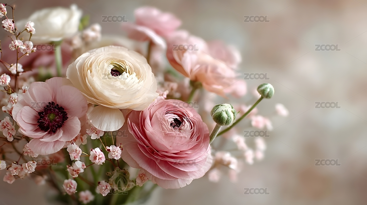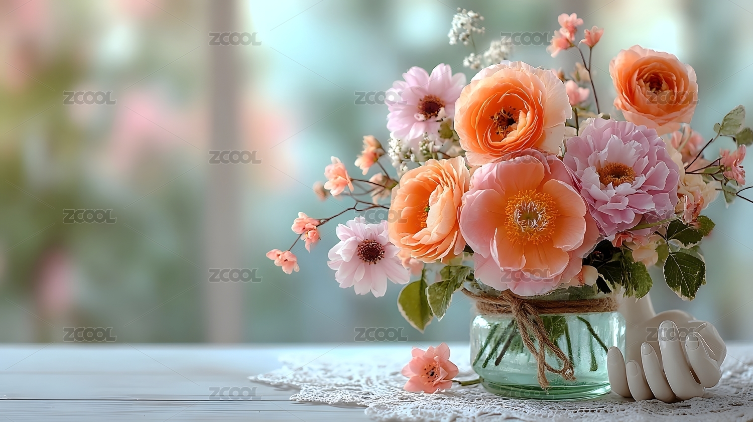 花卉,多彩花朵,户外场景,木质桌面,粉色花朵,白色花朵,自然背景,红色花朵,篮子